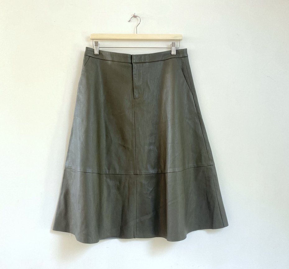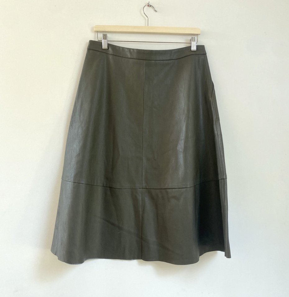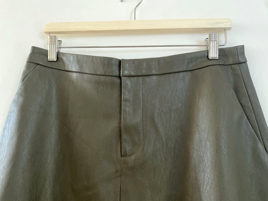 Spódnica z ekologicznej skóry, zapinana z przodu na zamek i guzik, po bokach kieszenie. Nowa, z metką.