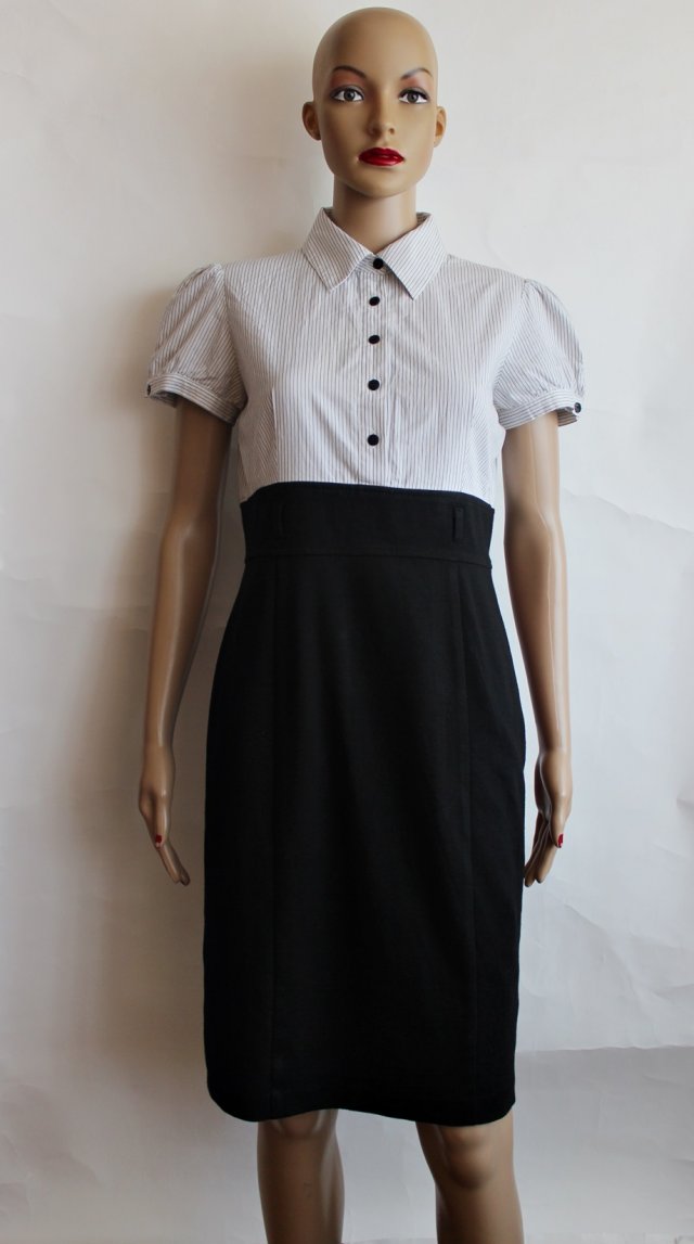 Górna część biała w delikatne paski, koszulowa, przy rękawach guziki.