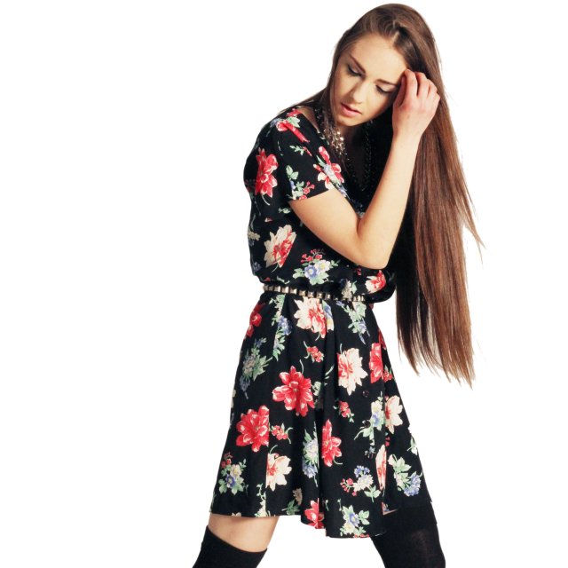 Śliczna letnia sukienka w bardzo modny kwiatowy motyw na czarnym tle.