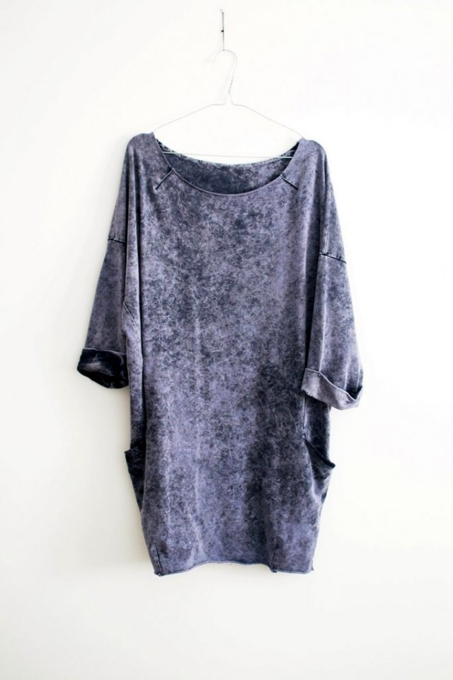 Marmurkowa sukienka oversize z kieszeniami. Dół i dekolt z surowym wykończeniem. Materiał przypomina dres.