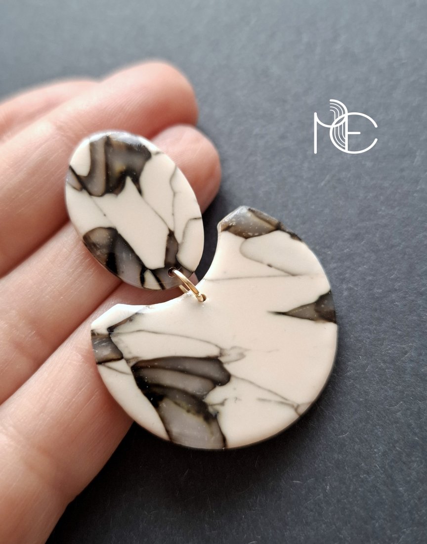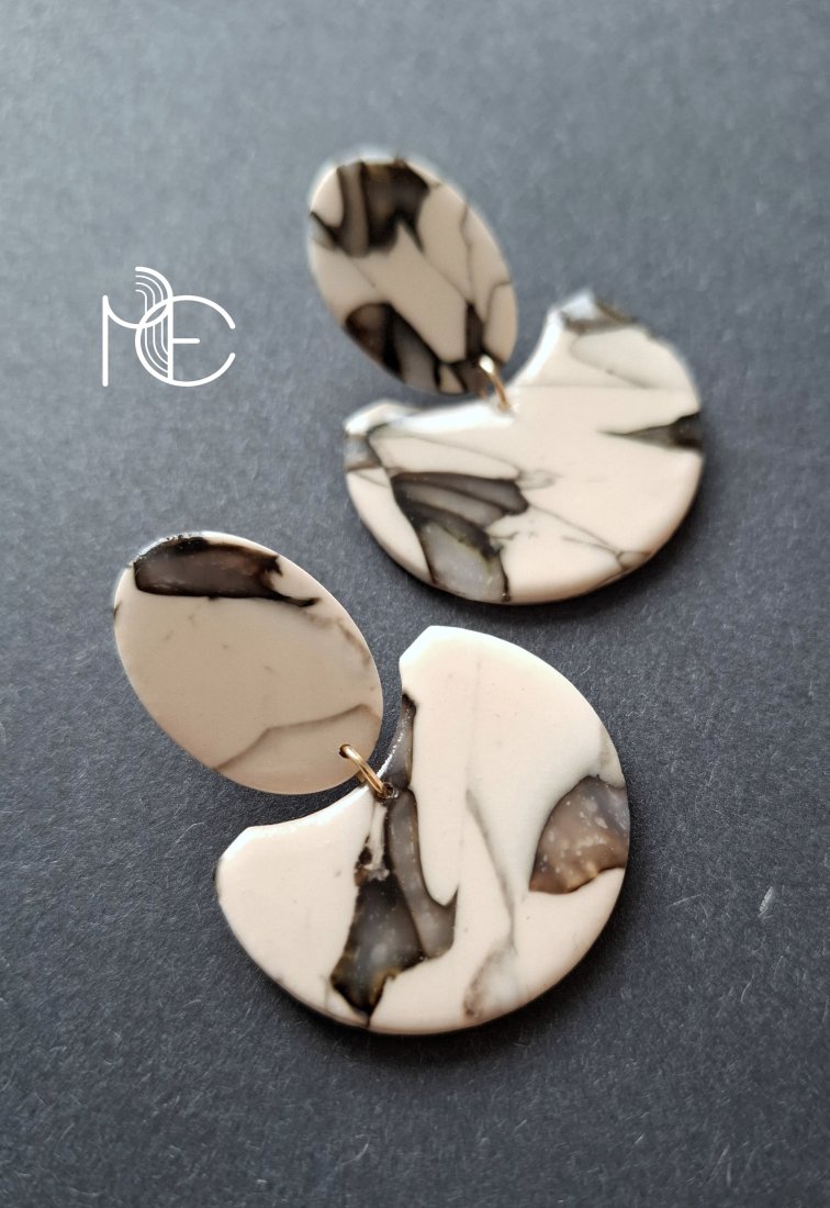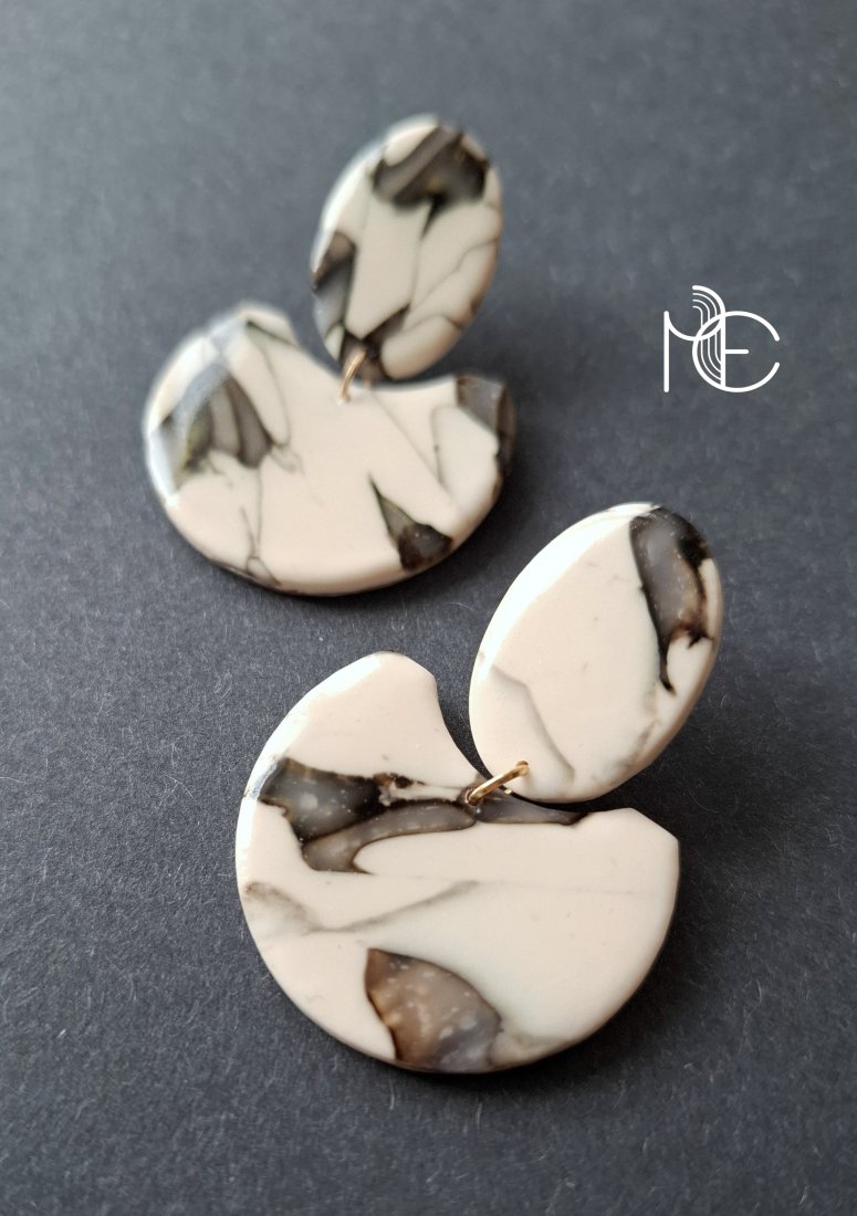Lekkie kolczyki na sztyfty wykonane z wysokiej jakości glinki polimerowej z efektem półprzezroczystości. Jednostronne z pozłacanymi, nieuczulającymi sztyftami. Wymiary: długość wraz z zapięciem: 4,7 cm; szerokość max. 3,5 cm. Wykonane w jedynym egzemplarzu.