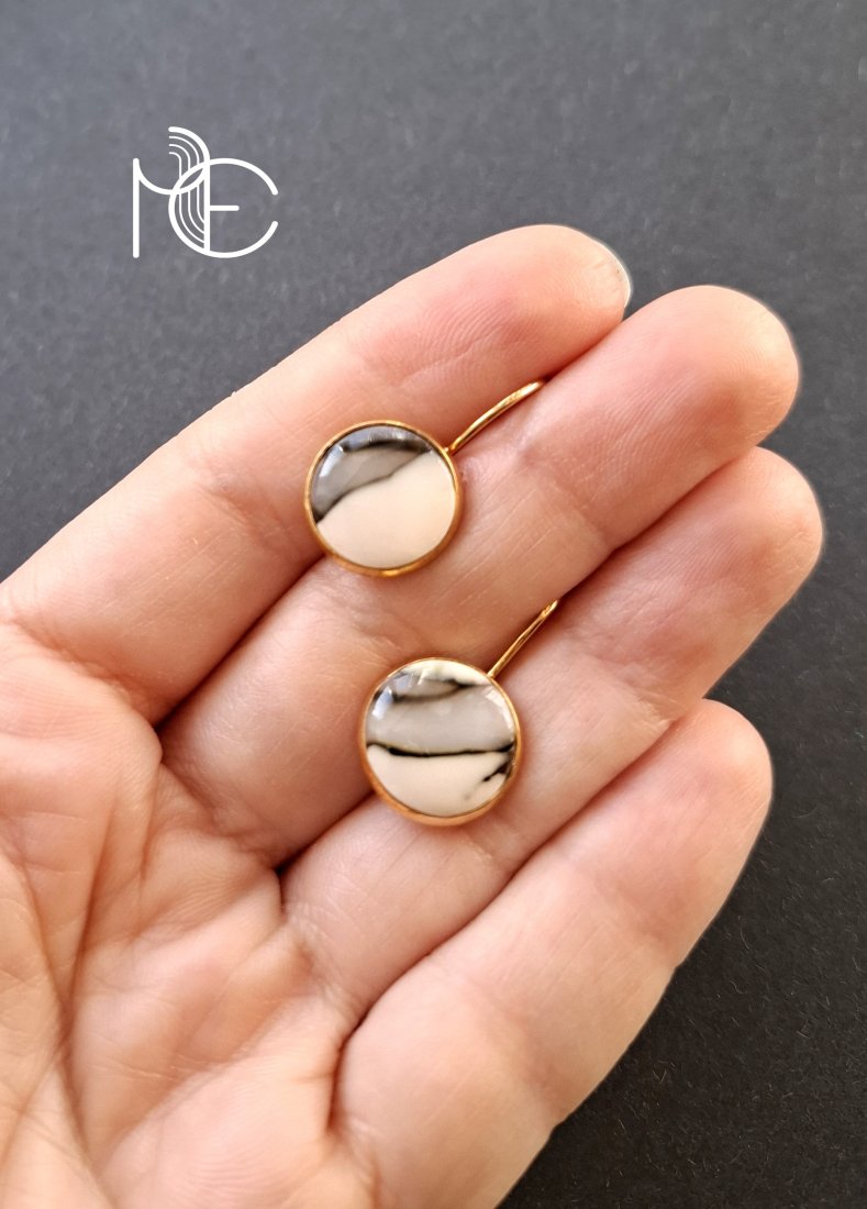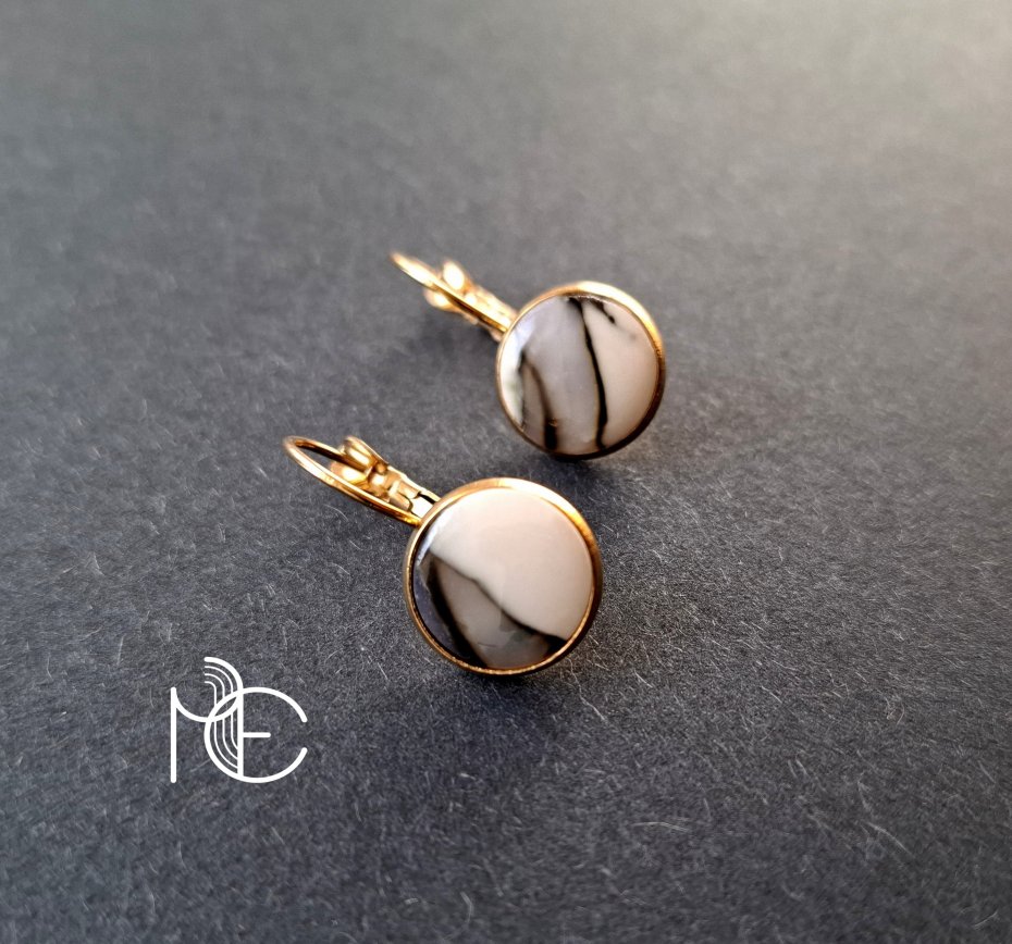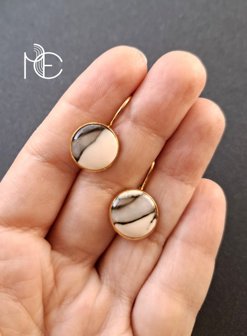 Ozdobne kolczyki wiszące wykonane z wysokiej jakości glinki polimerowej. Kolczyki o bazie pozłacanej, nieuczulającej. Wymiary - długość całkowita: 2,5 cm; średnica motywu: 1,4 cm. Wykonane w jedynym egzemplarzu.