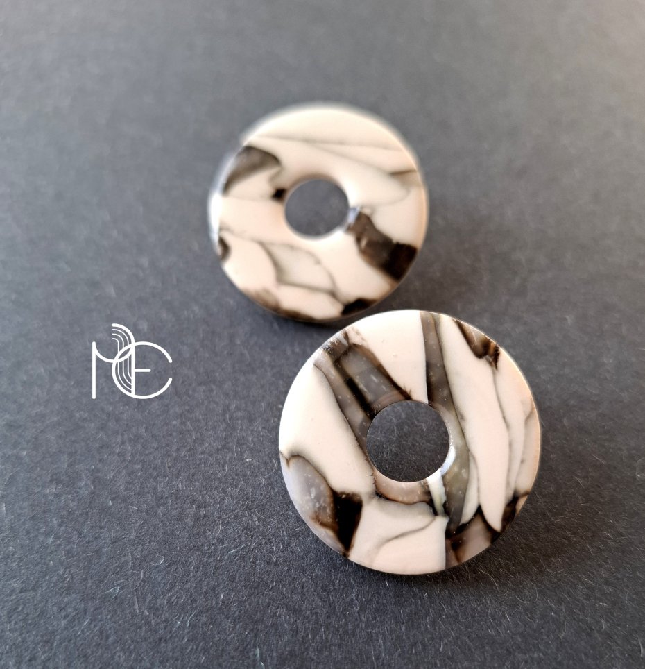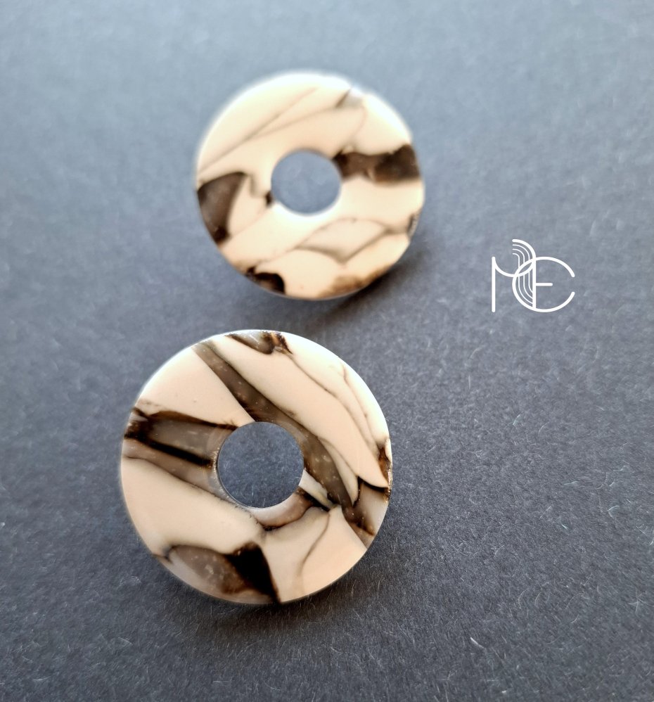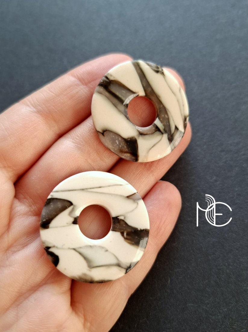 Lekkie kolczyki na sztyfty wykonane z wysokiej jakości glinki polimerowej z efektem półprzezroczystości. Jednostronne z pozłacanymi, nieuczulającymi sztyftami. Wymiary: długość wraz z zapięciem: 3 cm; szerokość max. 3 cm. Wykonane w jedynym egzemplarzu.