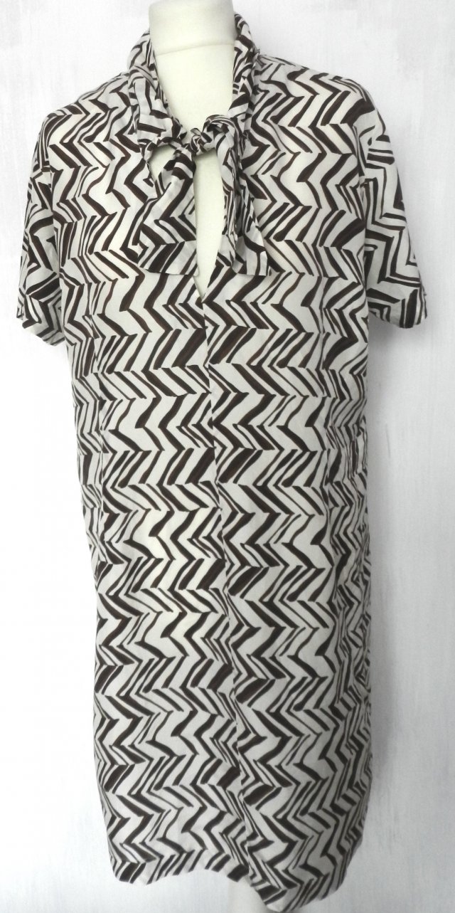 Sukienka ma w zamyśle luźny fason, dekolt stójka z wiązaniem na dekolcie