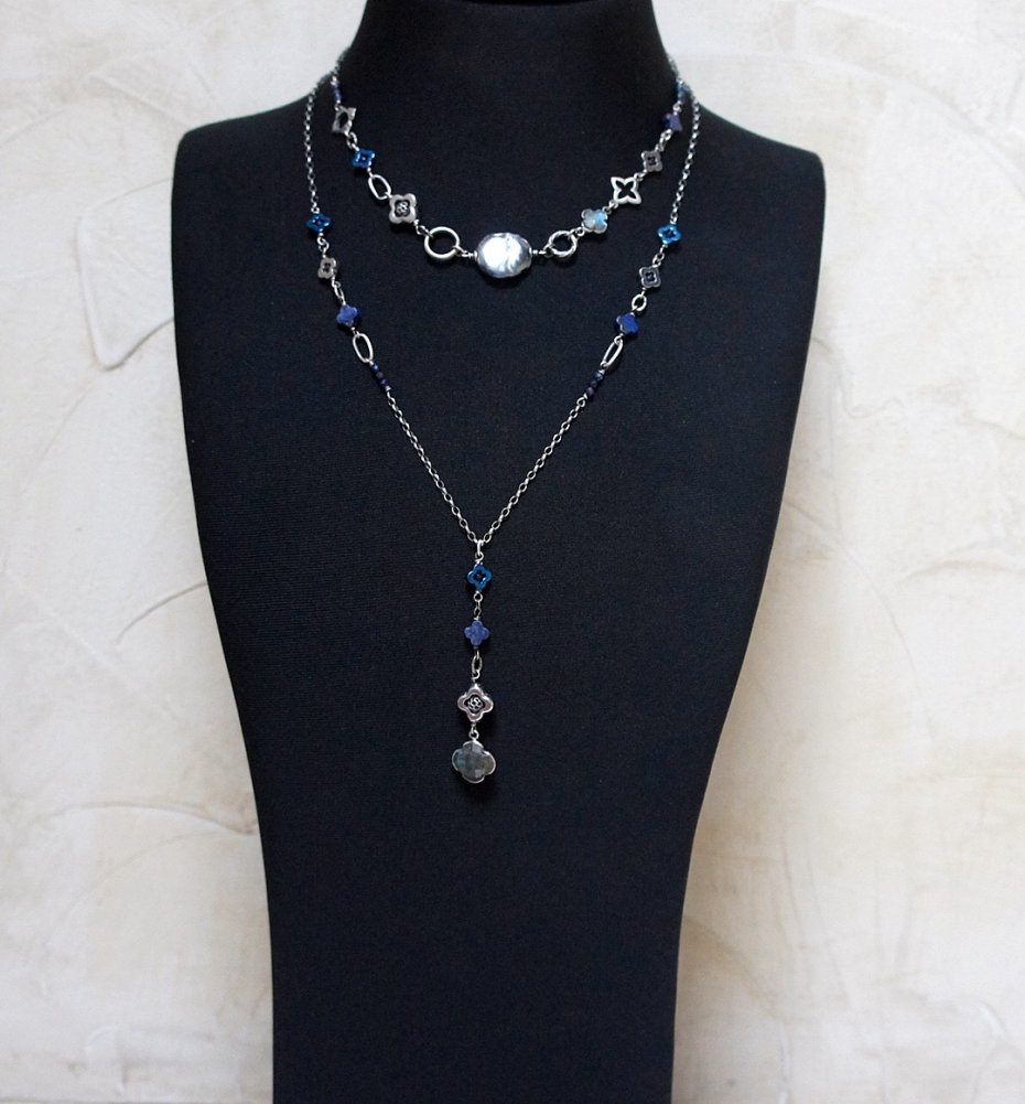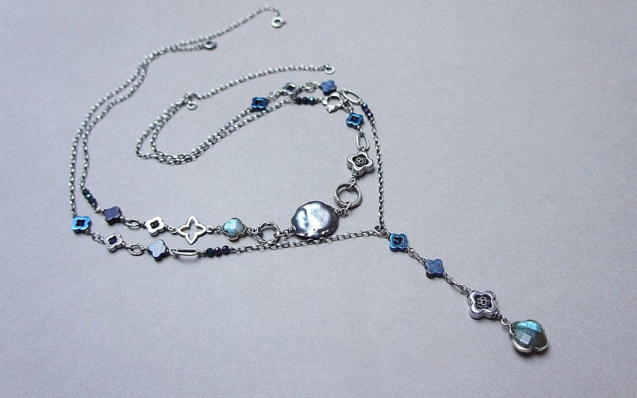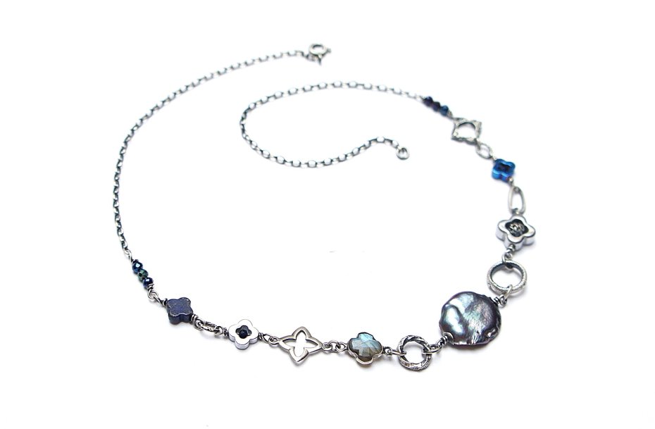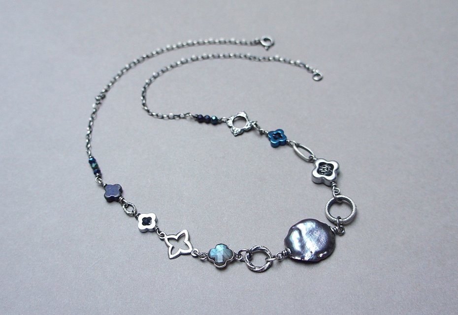 Naszyjnik wykonany ze srebra pr. 925 w połączeniu z naturalną perłą biwa [18mm ], hematytowymi koniczynkami [ 8mm i 12mm], fasetowanymi spinelami mystic [3mm], szafirami[2mm - syntetyczne], lapisem lazuli [8mm - koniczynka], labradorytem w okuciu oraz srebrnymi ozdobnikami [koniczynki i ogniwa]. Srebro oksydowane i przetarte. Całkowita długość naszyjnika 46,5cm. Biżuteria ozdobnie zapakowana.