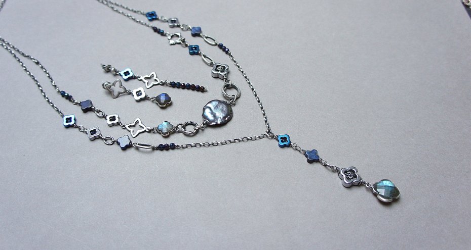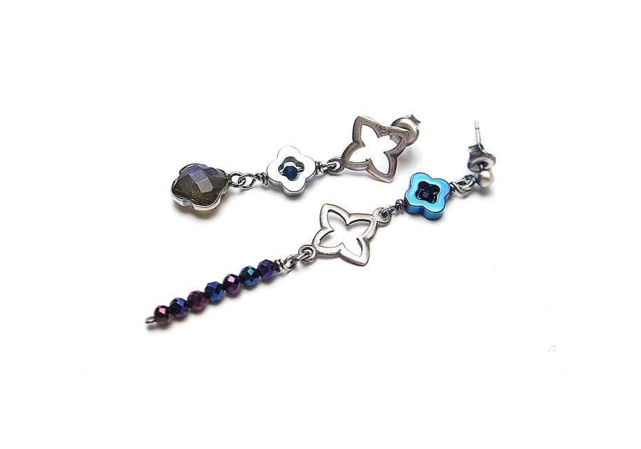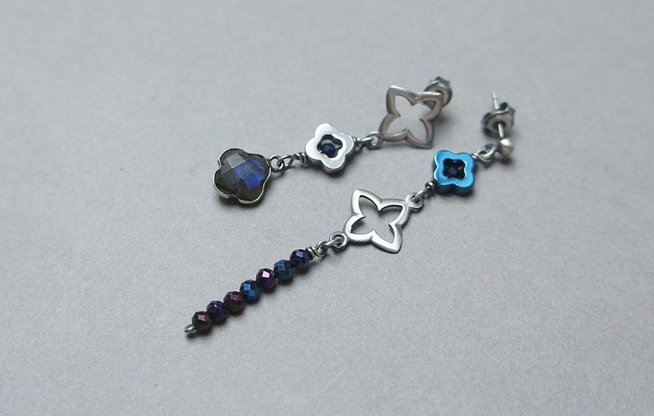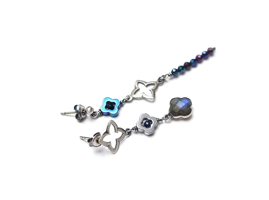 Kolczyki asymetryczne wykonane ze srebra [pr. 925] w połączeniu z fasetowanymi kuleczkami spineli mystic [3mm], koniczynką labradorytu w okuciu, fasetowanymi szafirami [2mm - syntetyczne] oraz hematytowymi koniczynkami. Srebro oksydowane i przetarte. Całkowita długość kolczyków: 6,3cm i 4,2cm. Biżuteria ozdobnie zapakowana.