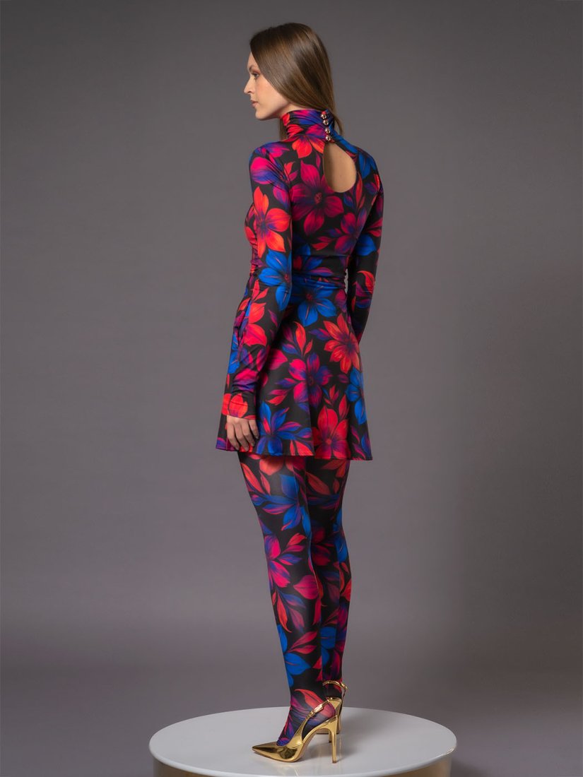 Marta Flower Power - sukienka mini z golfem, zapinana na złote guziki, z wygodnymi kieszeniami — łączy w sobie energię koloru i funkcjonalność. Wykonana z elastycznej dzianiny o autorskim princie "Flower Power", który zachwyca połączeniem fuksji, pomarańczy i kobaltu na czarnym tle.