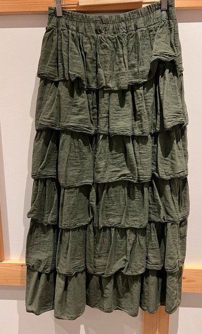 długa dwuwarstwowa spódnica z falban na dzianinowym spodzie cienka mięta bawełna styl Rundholz Moyuru Annette Gortz długość 95 pas 38/55x2 świetna stylowa unikatowa