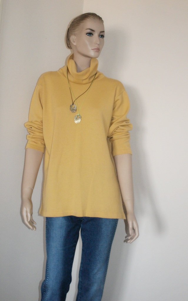 Ciepły golf vintage w pięknym słonecznym kolorze, materiał 50% wełny merynosów, 50% akrylu. Pacha szersza prosto podkrojona. Rozmiar z metki 42. Na manekinie o rozmiarze 38. Stan bardzo dobry. Podaję wymiary mierzone na płasko;
