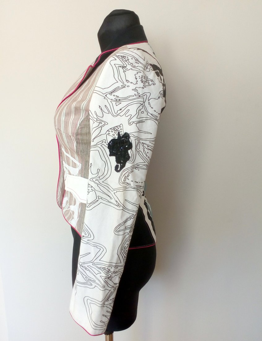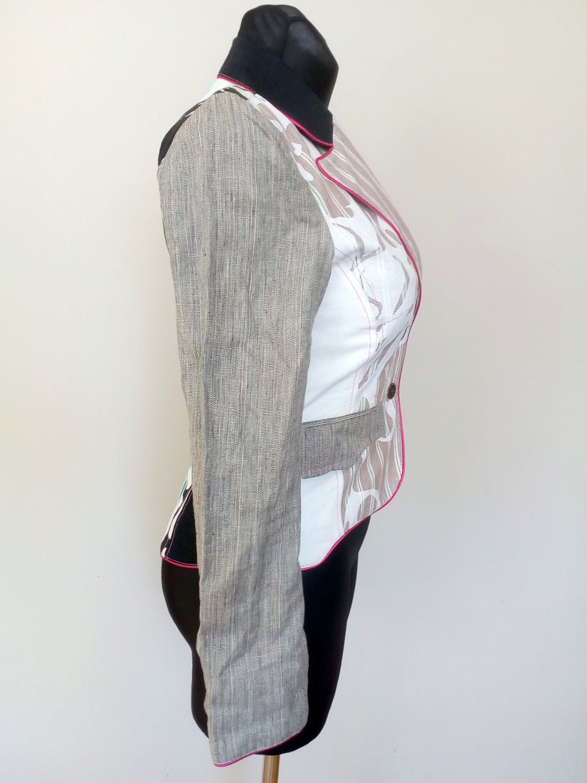 Uroczy, krótki żakiet z udziałem lnu, zapinany na dwa metalowe guziki w kolorze starego złota, u dołu przodu dwie poziomo wpuszczane kieszenie z patkami, od środka dwie boczne kieszenie, żakiet na bawełnianej podszewce w różowym kolorze