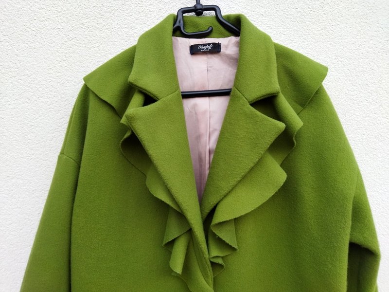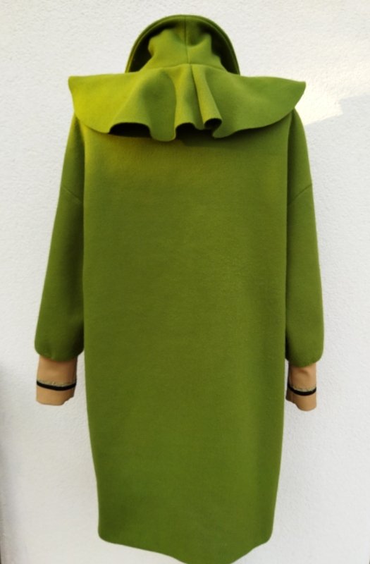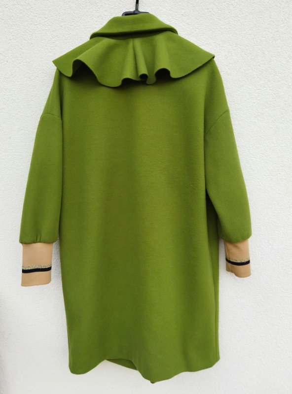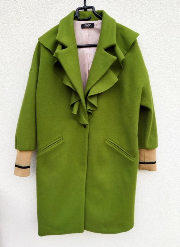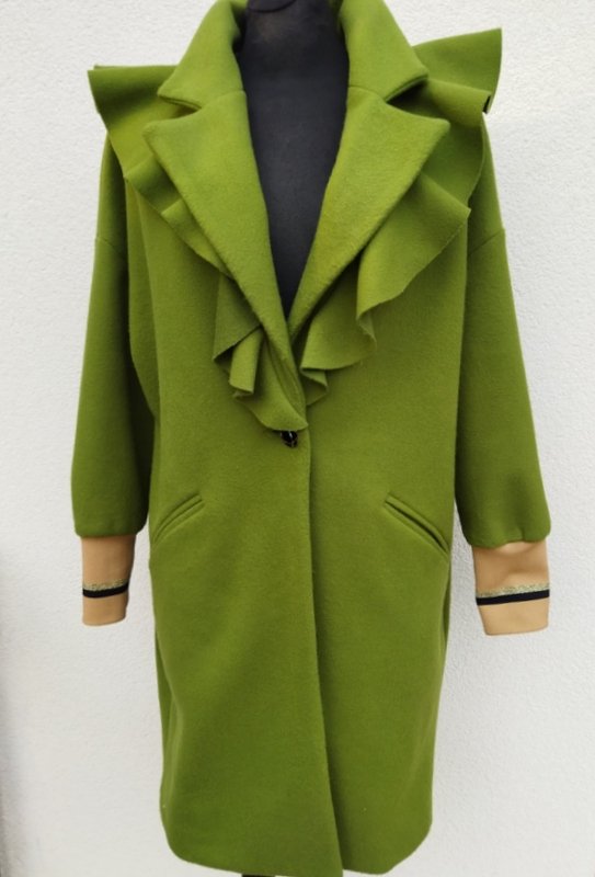 Płaszcz o ciekawym kroju z flauszowej tkaniny poliestrowej w kolorze wiosennej zieleni, rękawy wykończone ściągaczami w beżowym kolorze z czarno -złotymi paseczkami. Z kołnierzem z rewersami i ozdobną falbaną , z dwiema wpuszczanymi kieszeniami. zapinany na jeden ozdobny guzik. Całość na podszewce