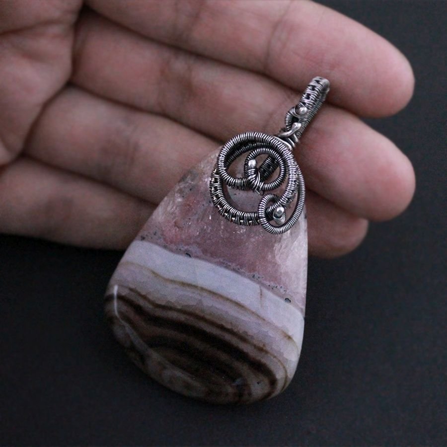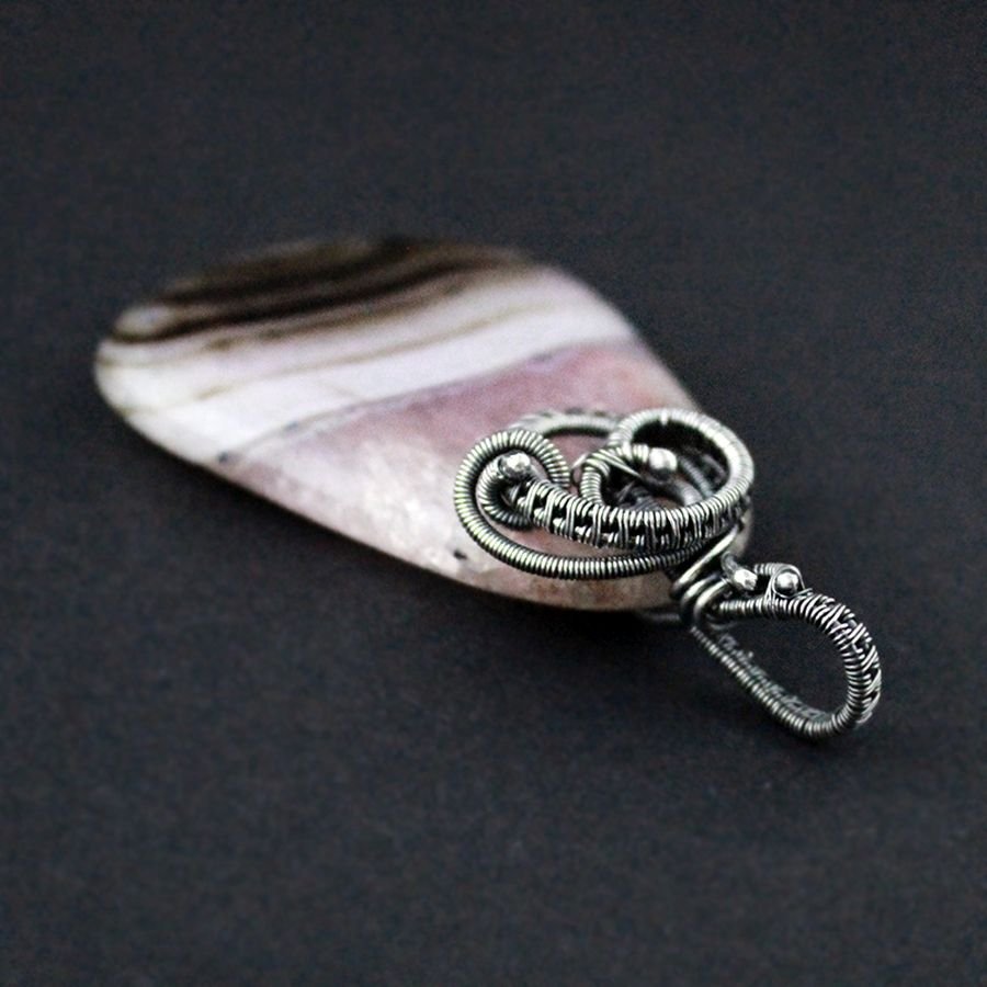 Ten duży, polerowany plaster chalcedonu to opowieść o subtelnej elegancji zaklętej w kamieniu. Naturalna paleta barw – od jasnego i łososiowego różu, przez kremowe tony, aż po ciepłą kawę z mlekiem i głęboki ciemny brąz – tworzy harmonijną kompozycję, która przyciąga spojrzenia i koi zmysły. Chalcedon o wymiarach 4,8 x 3,9 x 0,6 cm został ręcznie opleciony oksydowanym srebrem próby 999 i 925 w misternie wykonanej technice wire-wrapping, która podkreśla wyjątkowy charakter kamienia. Gotowy wisior mierzy 6,3 x 3,9 cm – idealny do noszenia na rzemieniu lub łańcuszku (duże oczko o wymiarach wewnętrznych: 1,0 x 0,7 cm). To biżuteria z duszą – delikatna, a zarazem wyrazista. Kolory na zdjęciu mogą nieznacznie różnić się od rzeczywistych – proszę kierować się opisem. Wisior z chalcedonem to nie tylko ozdoba, to wyjątkowy talizman niosący ciepło i spokój.