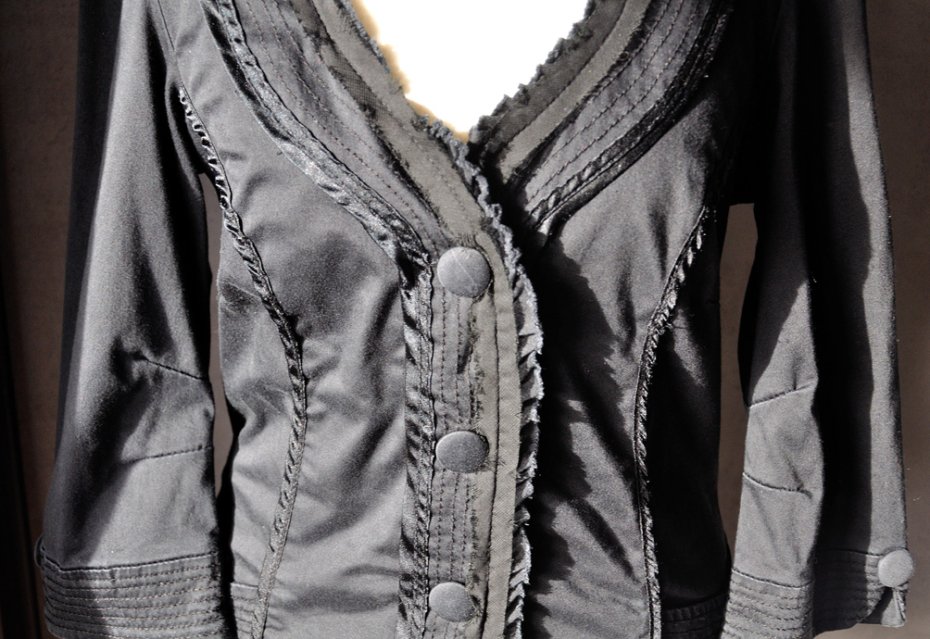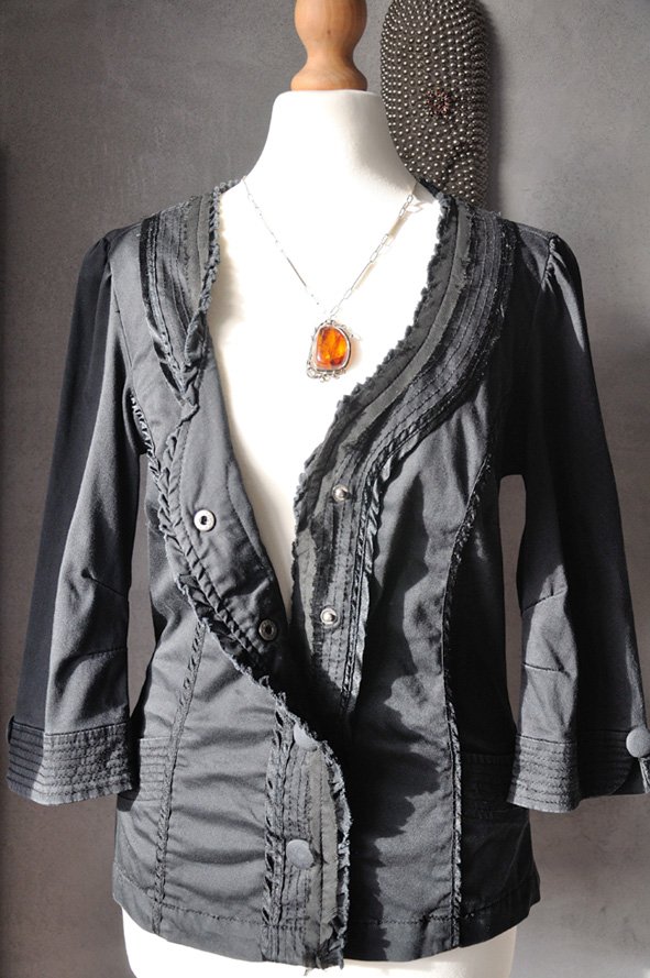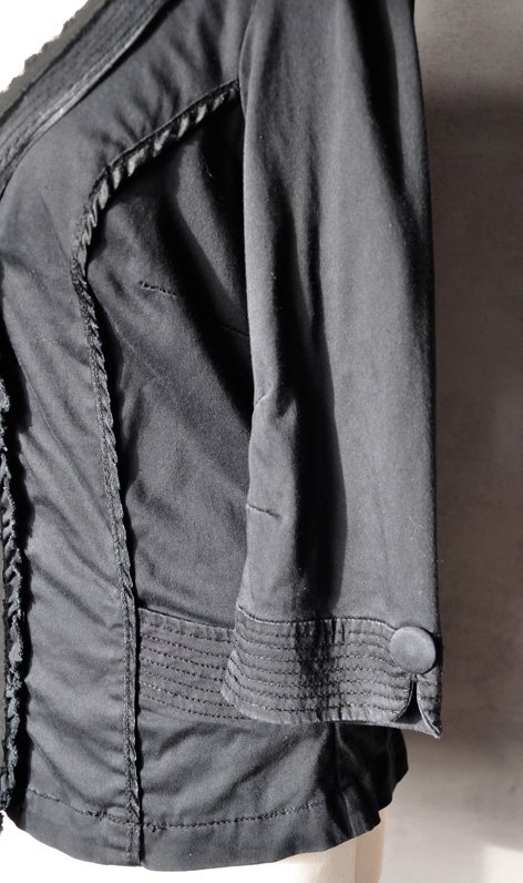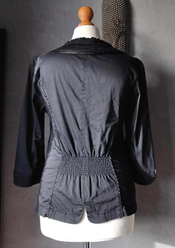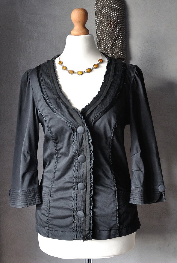 Uszyta z czarnej, grubszej bawełny "koszulowej". Miłej w dotyku, dość miękkiej, zarazem solidnej i dobrze się układającej. Część przeszyć została obszyta satynową, czarną tkaniną, część - czarnym, cienkim szyfonem. Fason jest niezwykły: dłuższy, bardzo dopasowany; dzięki zaszewkom, miękkim liniom i przeszyciom pięknie prezentuje się na sylwetce. Rękawy 3/4, na ramionach bufki. Mankiety z przeszyciami i dużym guzikiem. Żakiet zapinany na zatrzaski, ukryte pod dużymi guzikami. Z tyłu, w talii przymarszczenie i gumki, dzięki czemu żakiet jest dopasowany. Przeszycia na zapięciu i wokół szyi; na bokach kieszonki.