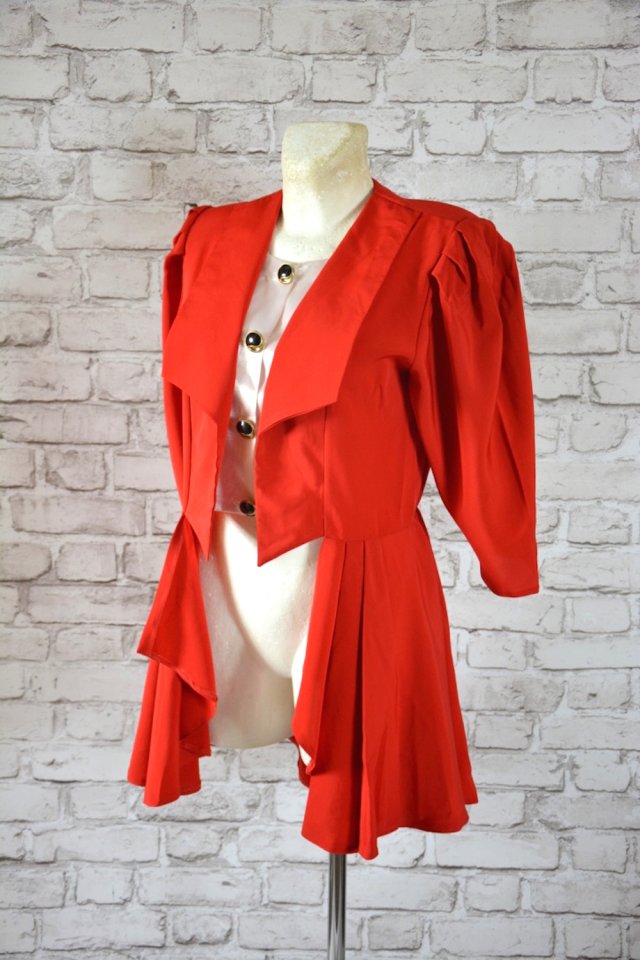 Unikatowa czerwona marynarka vintage w formie fraka zapinana na guziczki, tył nieznacznie dłuższy od przodu, marynarka składa się z 2 części, biała część w formie bluzki zapinanej na guziczki do pasa jest integralną częścią całości,wierzchnia część (marynarka ) o otwartym kroju z dużym efektownym kołnierzem , dół poszerzany , luźno opadający z kontrafłd.Ramiona delikatnie bufiaste.