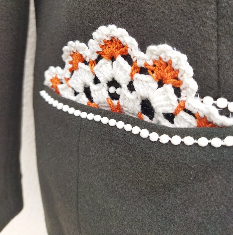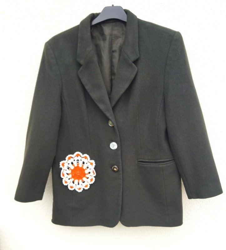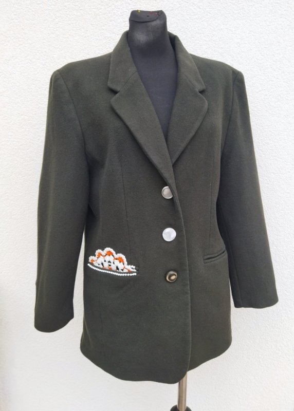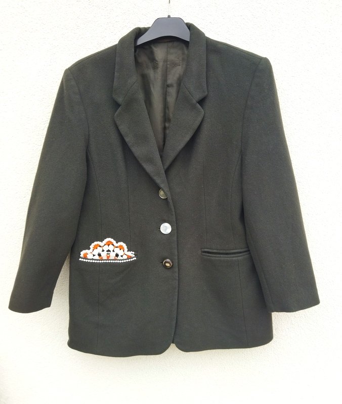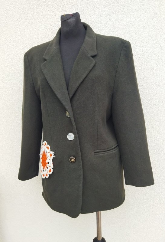 Dobrej jakości marynarka vintage w kolorze ciemnej zieleni z kropla szarości. Lekko taliowana, z kołnierzem z rewersami , z dwiema wpuszczanymi kieszeniami, w jednej z nich wkomponowana szydełkowa aplikacja, którą można nosić na dwa sposoby - na zewnątrz lub częściowo wsuniętą w kieszeń, brzegi kieszeni obszyte koralikowym łańcuszkiem. Ozdobą marynarki są również oryginalne guziki - każdy inny. Całośc na podszewce.