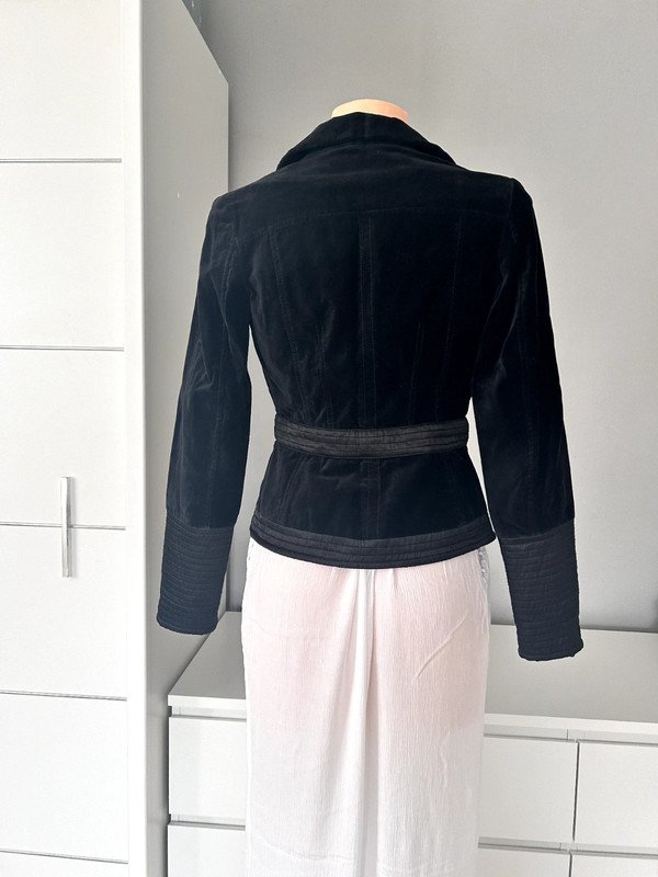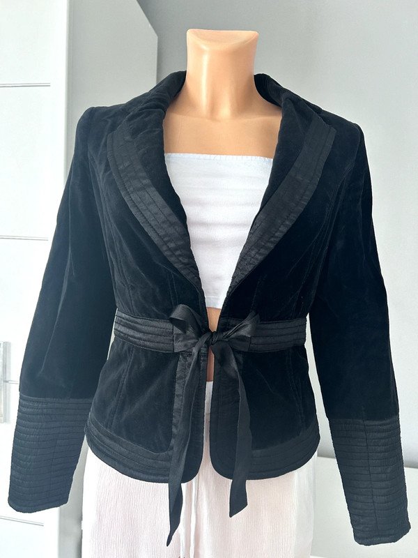 Marynarka żakiet bawełna 100 % z aksamitu rozmiar 34 firmy Reserved. W kolorze głębokiej czerni. Wykończenia i dodatki atłasowe, w pasie wiązana na wstążkę. Retro vintage, elegancka, klasyczna. Stan idealny, jedynie łańcuszek do wieszania do przyszycia. Polecam
