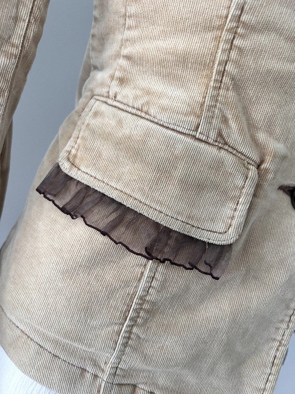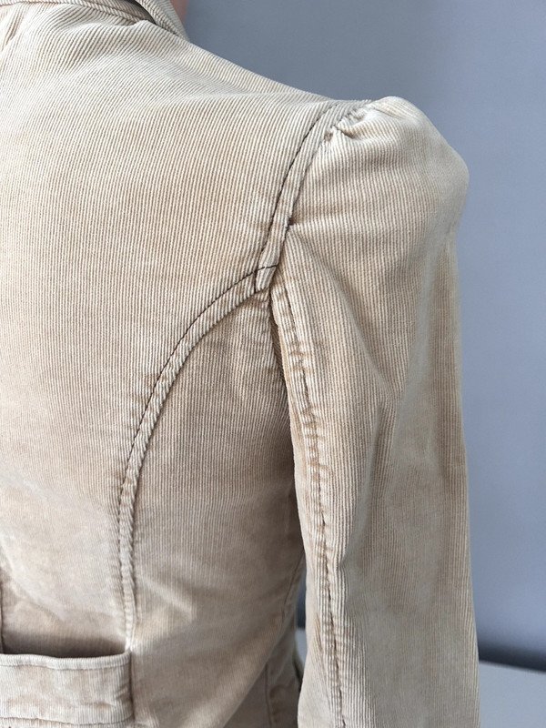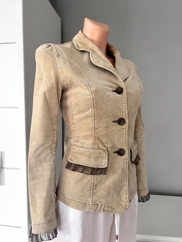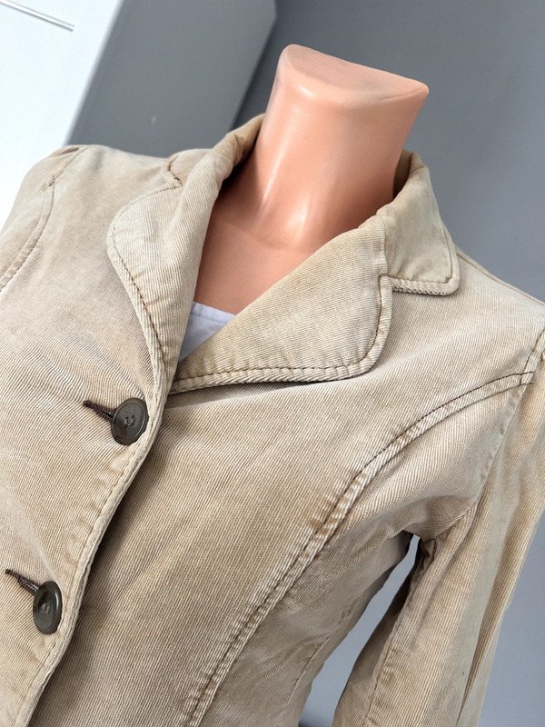 Marynarka żakiet firmy C&A elastyczny taliowany, z mięciutkiego, miłego w dotyku sztruksu, w piaskowym kolorze. Rozmiar określam na 32/34, ponieważ nie posiadam metki z rozmiarem (wymiary podaję poniżej). Pochodzi z lat 90, vintage, retro. Stan bardzo dobry. Polecam