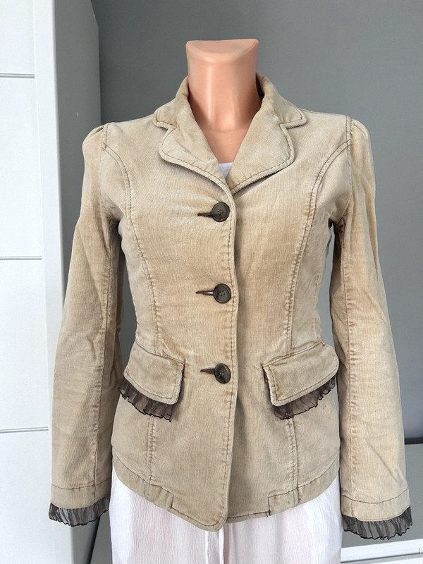 Marynarka żakiet firmy C&A elastyczny taliowany, z mięciutkiego, miłego w dotyku sztruksu, w piaskowym kolorze. Rozmiar określam na 32/34, ponieważ nie posiadam metki z rozmiarem (wymiary podaję poniżej). Pochodzi z lat 90, vintage, retro. Stan bardzo dobry. Polecam