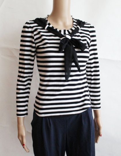 Efektowna oryginalna bluzka w stylu marynarskim w rozmiarze 38 Czarno-białe paski. Z przodu ciekawie zdobiona idącą od ramion pod szlufkami tiulową jakby apaszką w czarnym kolorze związaną w kokardę i zwieńczoną marynarskim dużym guzikiem. Materiał 100% bawełna. Stan bardzo dobry minus - posiada lekkie ślady użytkowania.
