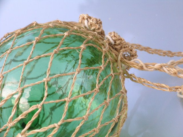 Grube Szkło w pieknej zieleni,chyba ręcznie wykonane / ma takie zakończenie z jednej strony kuli/ W naturalnie plecionej siateczce z uszkami do powieszenia. Prześwietlona rzuca refleksy zieleni i saiteczkowe cienie. Stosowane były takie Kule do utrzymywania sieci na powierzchni .Obecnie rzadko spotykane.