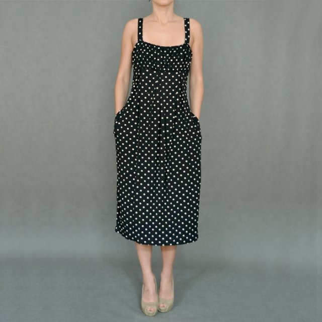 Sukienka w groszki z dziurką w środku. Krój zwężany ku dołowi, szerszy na biodrach. Po bokach kieszonki.