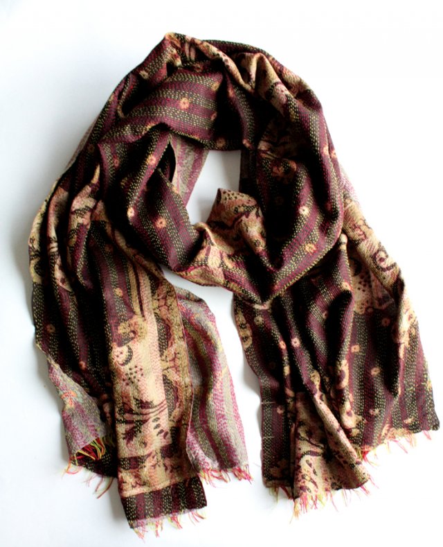 Fantazyjny duży szal marki MASALA. Szal jest dwustronny, pieczołowicie przetykany (prawdopodobnie ręcznie) na całej długości.