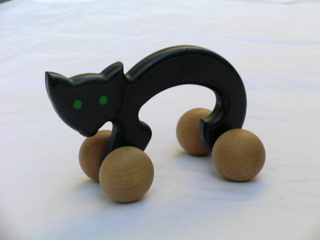 Fantastyczny, duży, wygodny masażer - w całości drewniany, naturalny. Wyśmienite wzornictwo :) Kółko-łapki się kręcą (rozstaw tylnych szerszy, i one większe), koci grzbiet super ergonomiczny. I te zielone oczy ! Dla zdrowia i dla urody. 18 x 11 x 11,5 cm. Sygnowane Rollfit. Stan zachowania bardzo dobry.