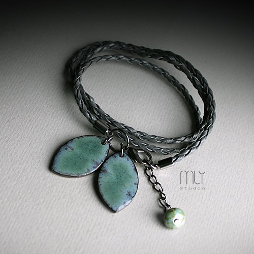 Efektowna bransoletka wykonana z rzemienia jubilerskiego w kolorze szarym elementów w kolorze ciemnego srebra i ręcznie wykonanych ceramicznych zawieszek, szkliwionych mieszanką szarozielonych szkliw z efektem plamek o subtelnym połysku, Obwód regulowany. Polecam. Termin realizacji zamówienia to 1-2 dni.