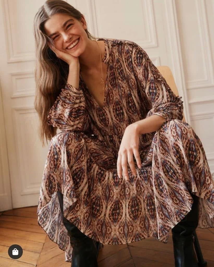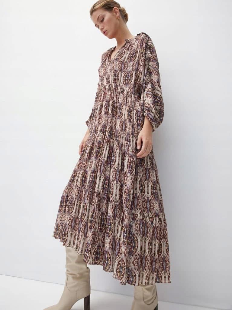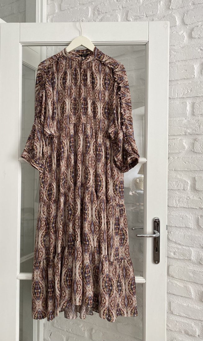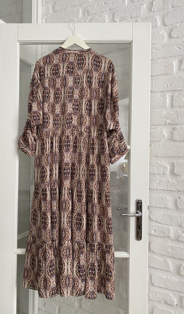 Kolorowa sukienka w hipnotyzujące wzory. Szerokie rękawy z falbanką. Fason oversize. Dekolt V. Ukryte boczne kieszenie.
