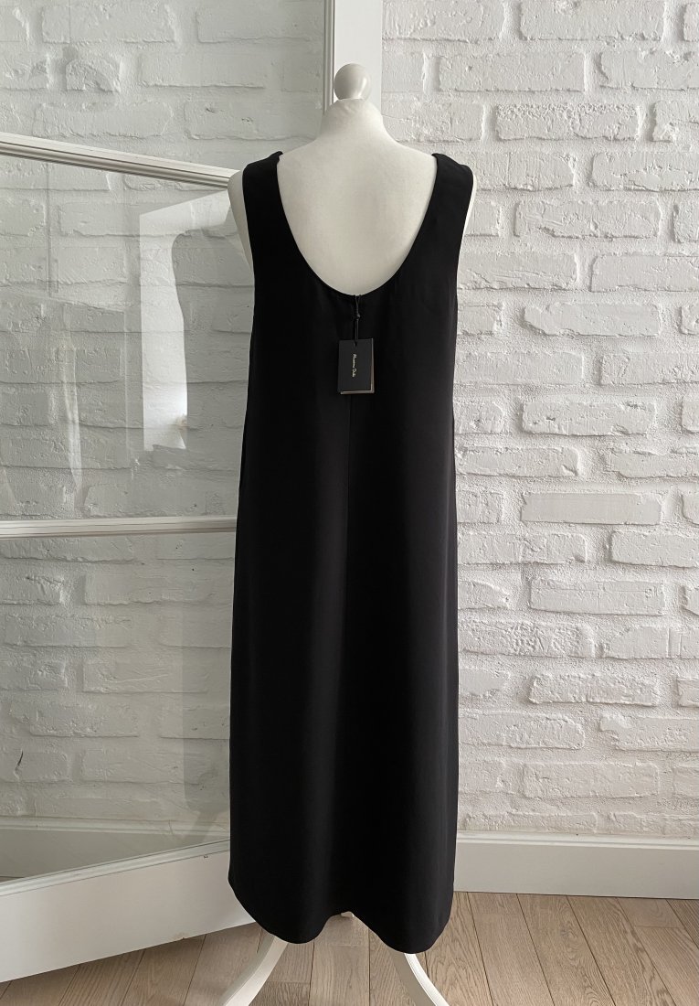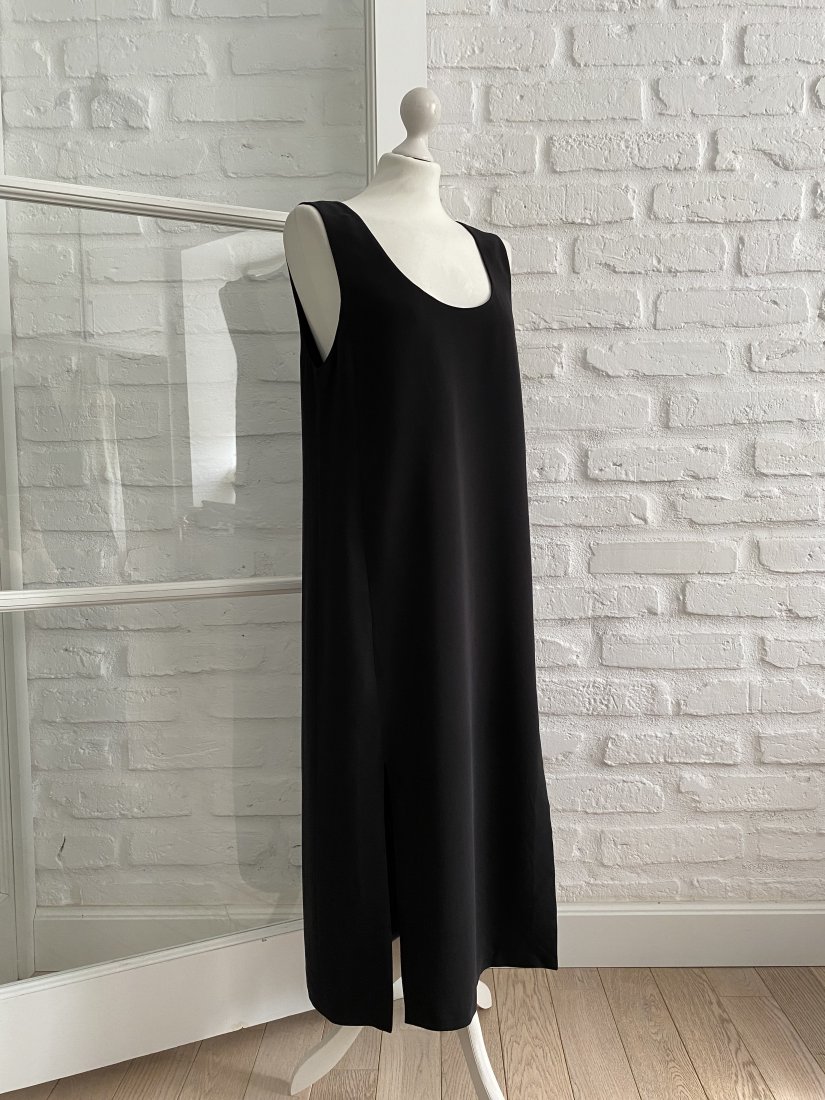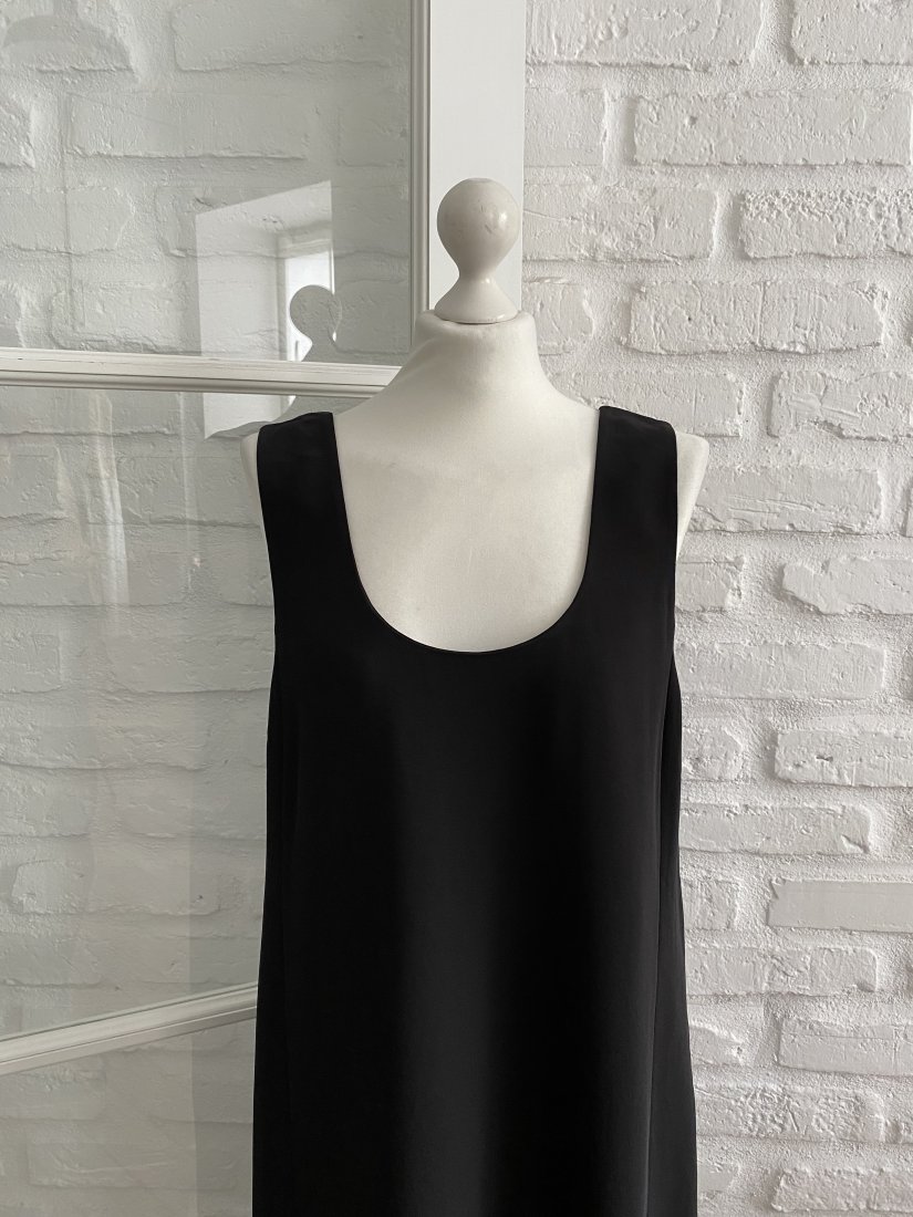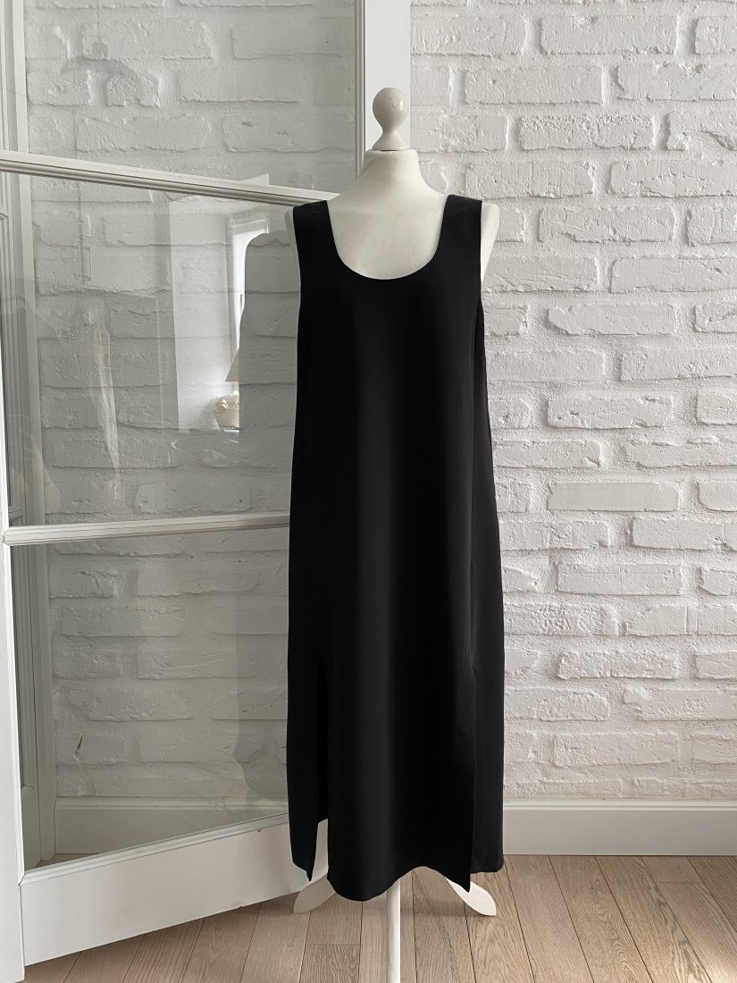 Czarna prosta sukienka na grubszych ramiączkach. Dwa rozcięcia z przodu na dole. Zapinana z boku na ukryty suwak. Bardzo kobieca. Całoroczna.