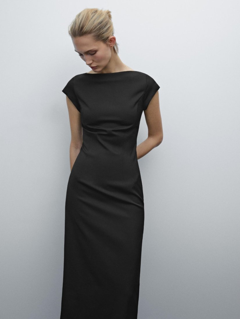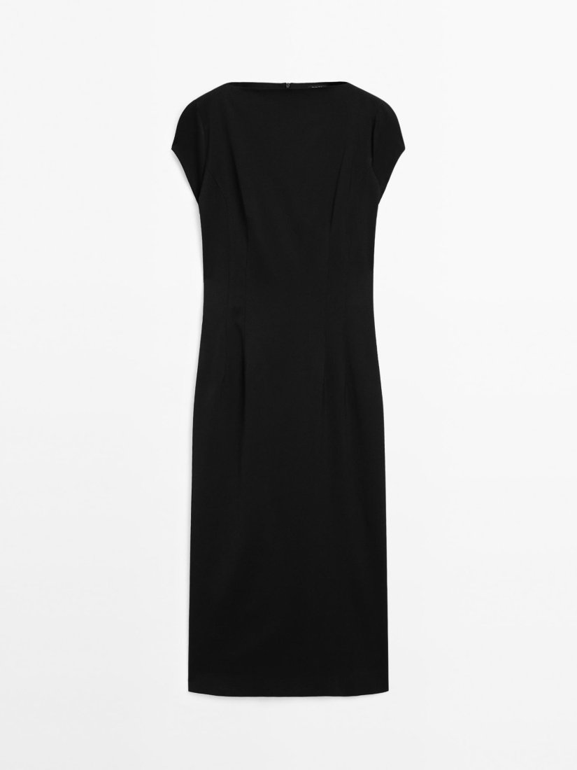 Czarna dopasowana sukienka o długości do połowy łydki. Pięknie wycięty dekolt. Niesamowicie kobieca i elegancka. Z rozcięciem z tyłu.