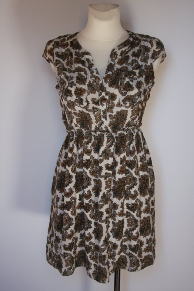 wzorzysta śliczna jedwabna sukienka renomowanej marki Massimo Dutti, króciutki rękawek, z przodu zapinana na dwa guziczki (posiada jeszcze jeden zapasowy), dosyć spory dekolt, na piersiach dwie malutkie kieszonki, w pasie gumka, jasna podszewka