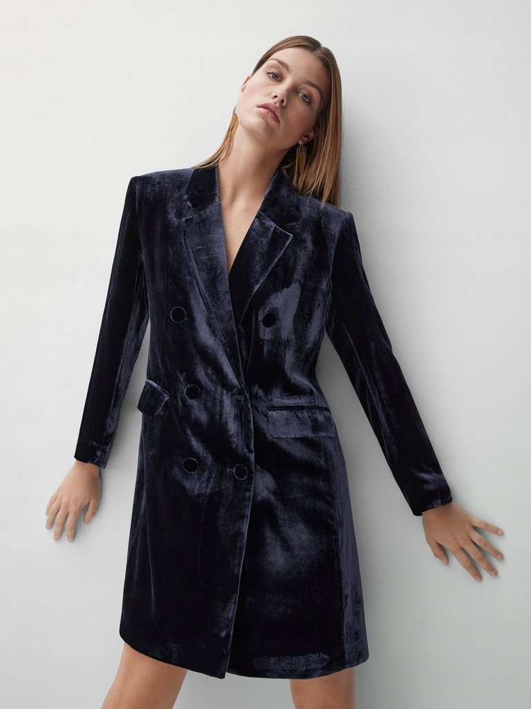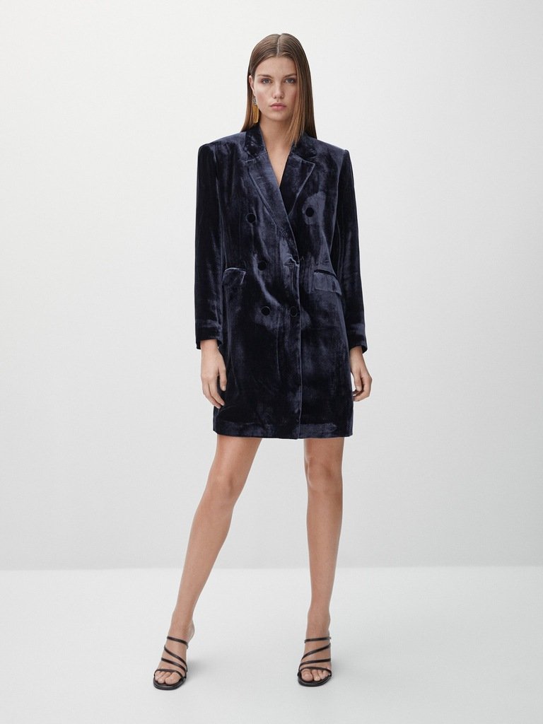 Granatowa sukienka z aksamitu z jedwabiem. Dwurzędowe zapięcie na obciągnięte aksamitem guziki. Przednie kieszenie z patkami.