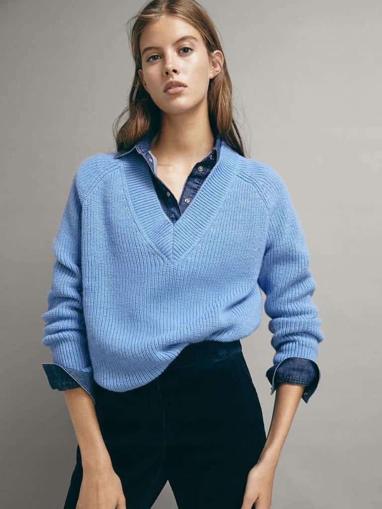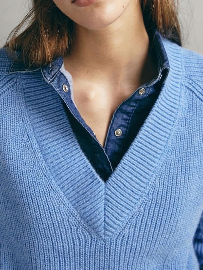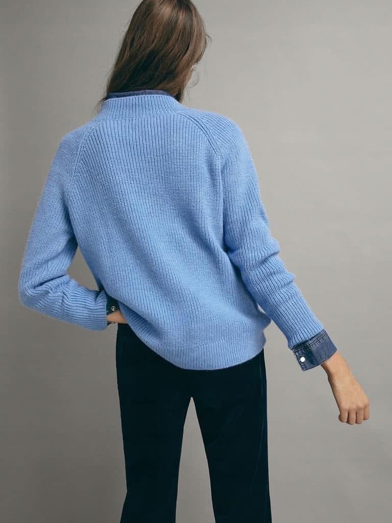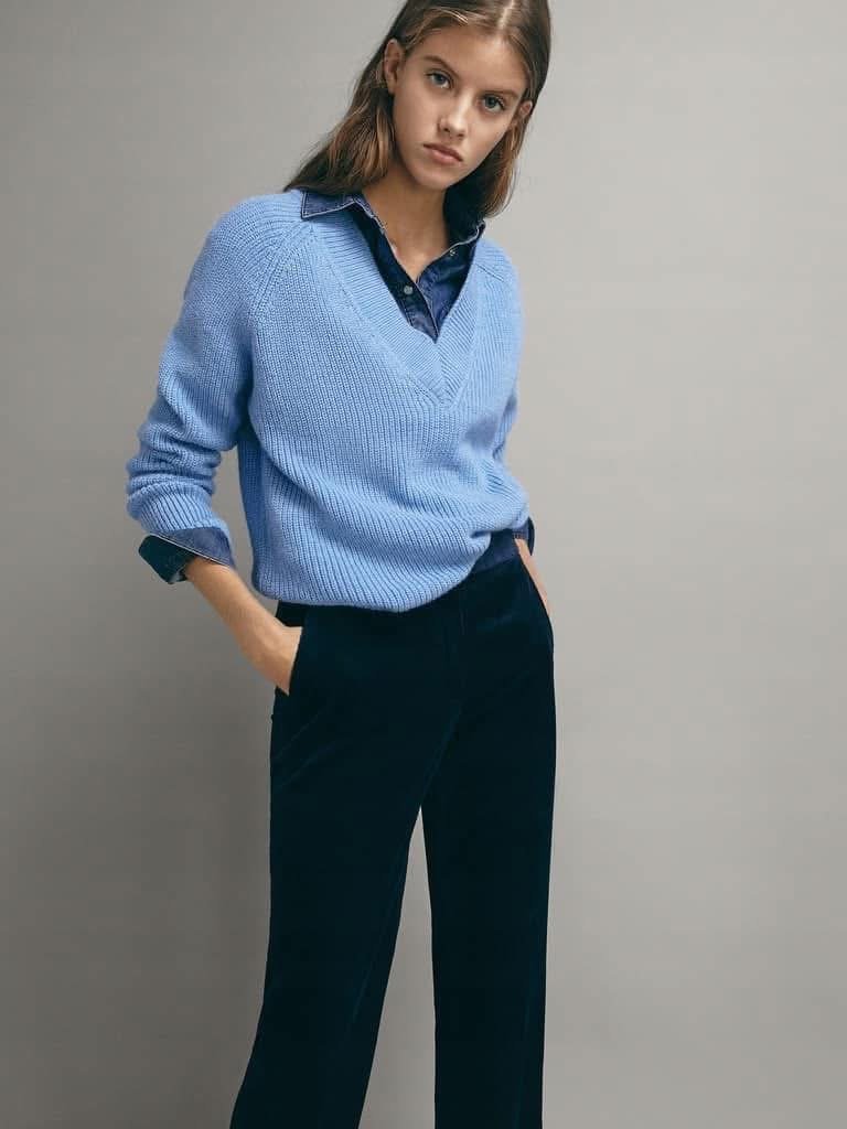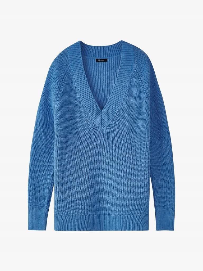 Sweter z wełną i alpaką w pięknym odcieniu niebieskiego. Dekolt V. Fason pudełkowy.