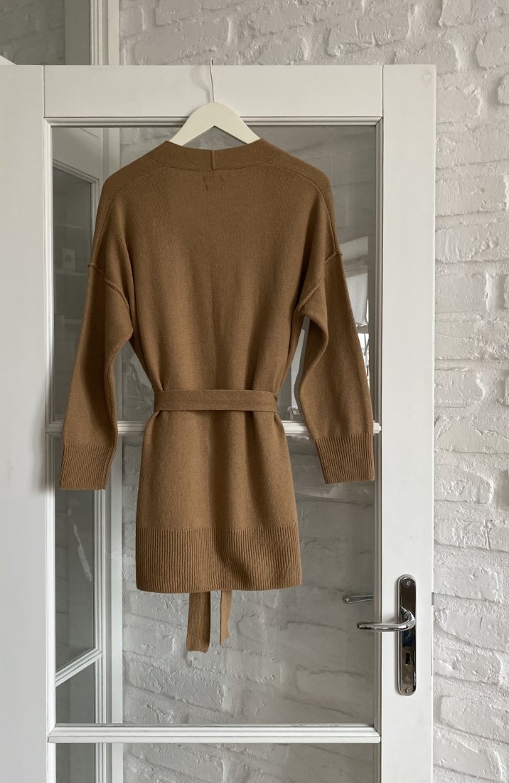 Kamelowy kardigan z wełną i kaszmirem. Obniżona linia ramion. Wiązany w pasie paskiem. Rozcięcia po bokach.