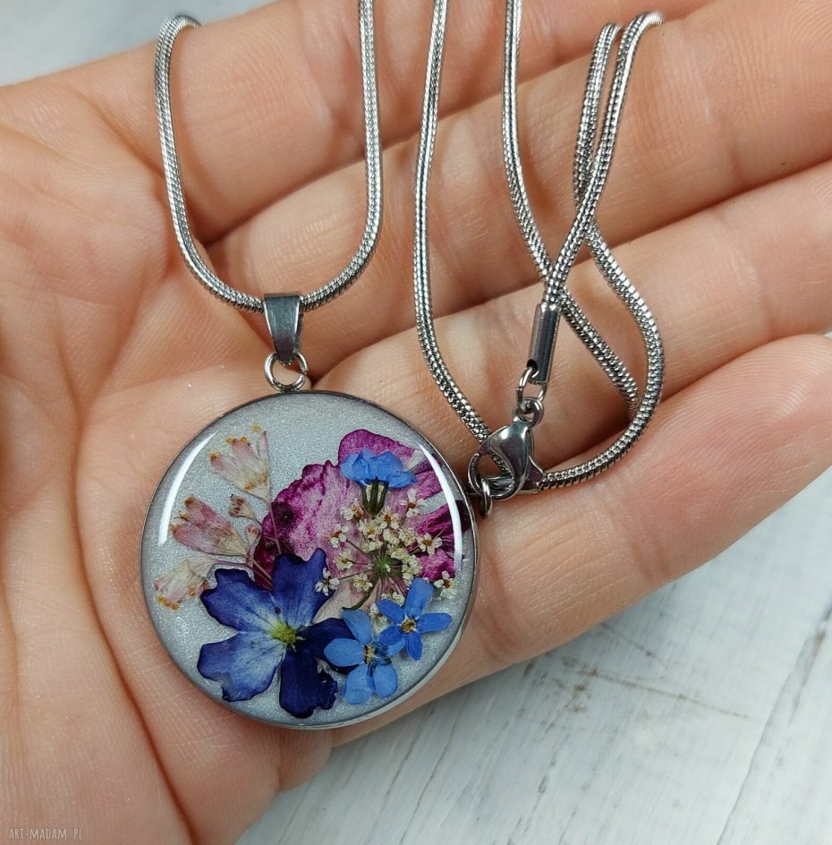 Zjawiskowy naszyjnik z suszonymi, naturalnymi kwiatami zalanymi żywicą UV. Na perłowym, białym tle suszone kwiaty w odcieniach różu, fioletu i niebieskim. To cudowna kompozycja w wakacyjnym klimacie. Do naszyjnika solidny, długi łańcuszek o dł 60cm (możliwość wymiany na krótszy) - wszystko wykonane ze stali nierdzewnej.