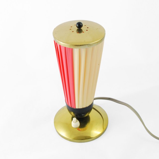 Lampa nocna z kloszem materiałowym z dwukolorowego tworzywa plisowanego. Podstawa i czapka wykonana z mosiądzu. Lampka na mały gwint, włącznik guzikowy. Lampka wyprodukowana na początku lat 50. przez Electro-Rausendorf Bautzen. Klasyka stylu mid-century modern.