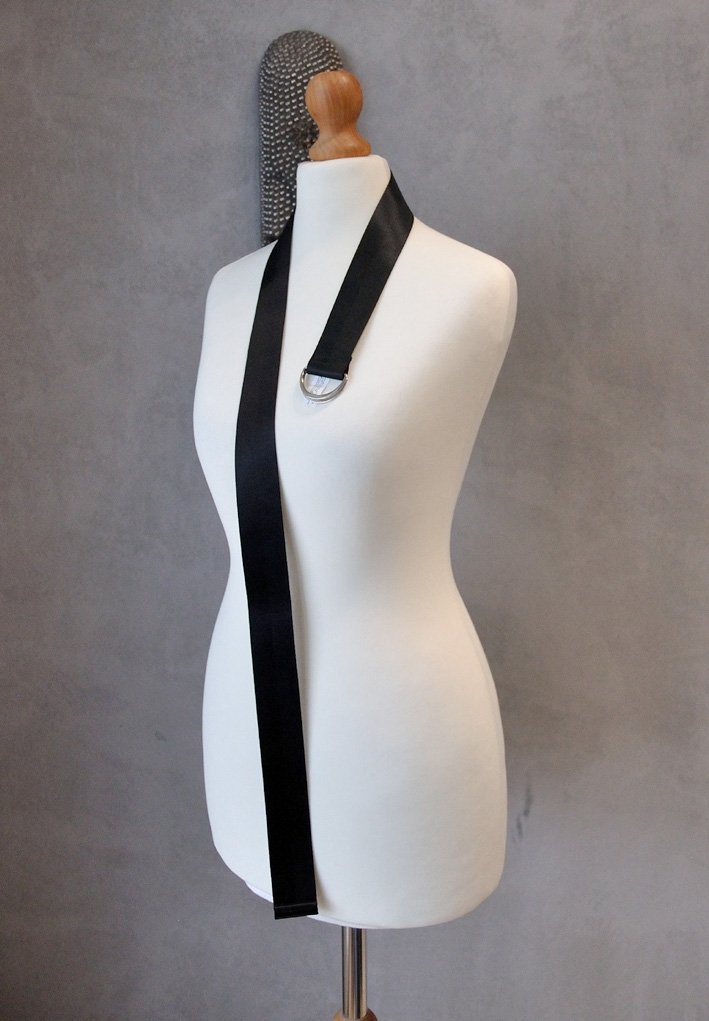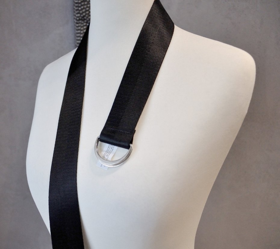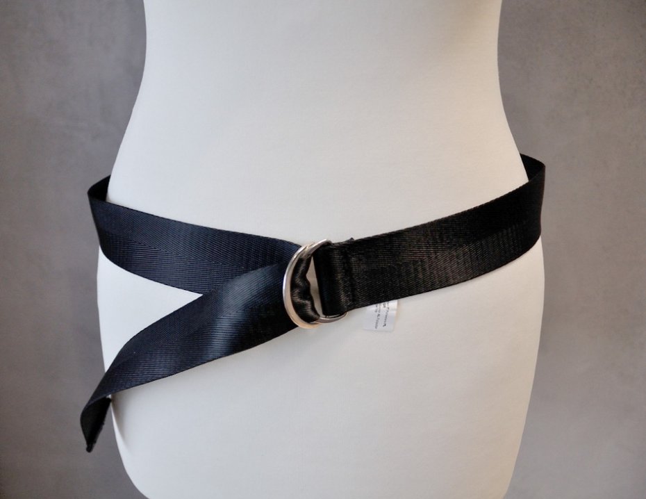 Średniej grubości, basicowy pasek wykonany z czarnej taśmy (fakturą przypomina samochodowy pas bezpieczeństwa, ale jest cieńszy). Marta TALLY WEIJL.