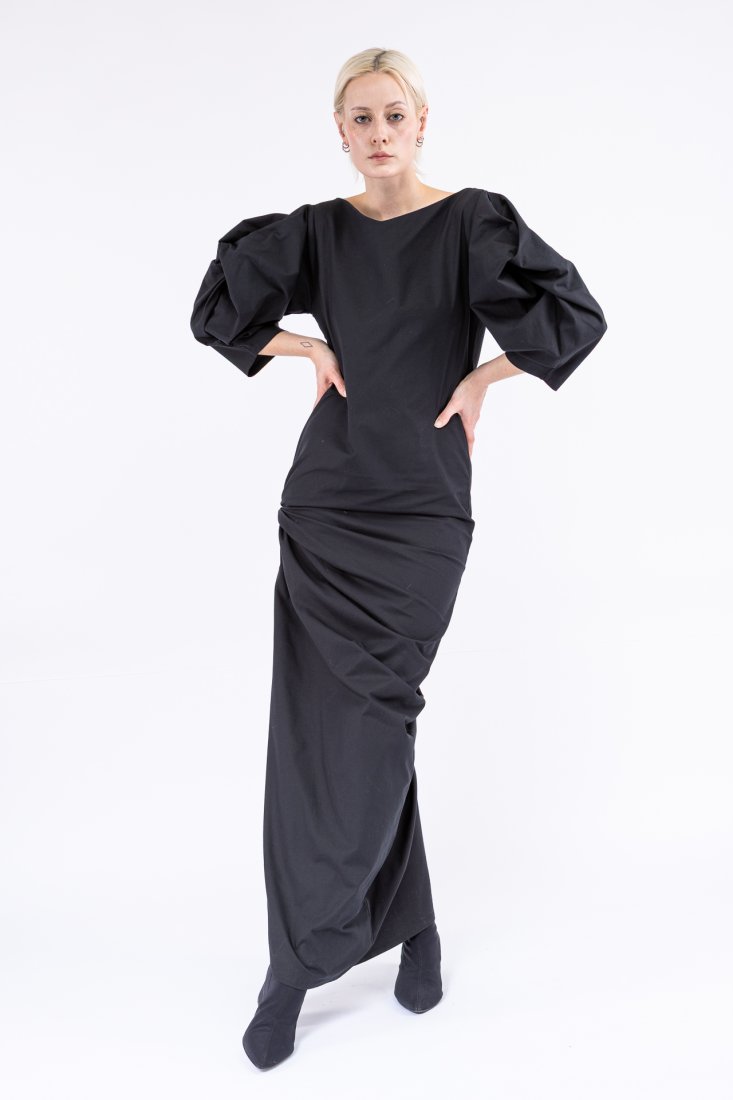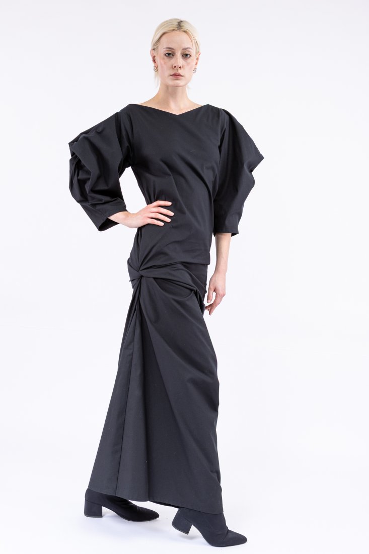 efektowna sukiena, asymetryczna dzięki ozdobnemu węzłowi na bocznym szwie, asymetryzującym jej linię, w trakcie poruszania drapuje się na drugim boku, rękawy bufiaste, wszyte bez marszczenia, sukiena jest blisko ciała, nie opina sylwetki, świetnie ukrywa manakmenty figury, wygodna, na co dzień i na wszelkie okazje, uszyta z mieszanki wiskozy lub bawełny z elastanem,