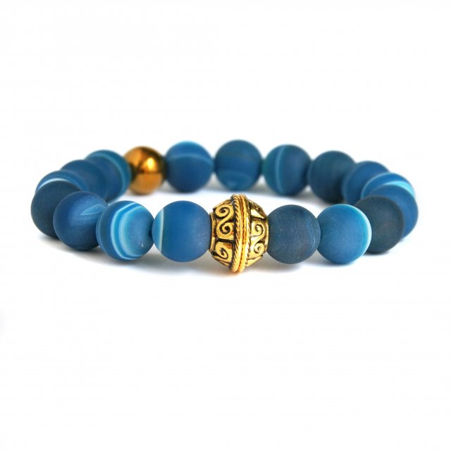 ciekawa i niezwykle efektowna bransoletka na solidnej lince elastycznej, wykonana z matowych kul pięknego matowego niebieskiego agatu (10mm) z dodatkiem jednej kuleczki złotego hematytu . ozdobna, metalowa przekładka. AGAT - kamień równowagi - fizycznej, emocjonalnej i intelektualnej. Harmonizuje; działa uspokajająco, dodaje pewności siebie. ZOBACZ CAŁĄ KOLEKCJĘ! bransoletka pasuje na nadgarstek 15-16,5cm. BIŻUTERIA ZAWSZE PODRÓŻUJE W OZDOBNYM OPAKOWANIU :-)