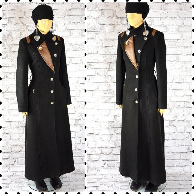 Cudny czarny płaszcz o poszerzanym kroju w militarnym stylu , z obszyciami ze skóry naturalnej przy kołnierzu i ramieniu, płaszcz na podszewce, zapinany na guziki, po bokach posiada kieszenie, pod szyją delikatna stójka. Płaszcz wykonany z bardzo przyjemnej, miłej w dotyku grubszej , rewelacyjnie trzymającej formę dzianiny (brak informacji co to za dzianina ). Posiada szlufki na pasek. Płaszcz rewelacyjnie skrojony, cudny polecam.