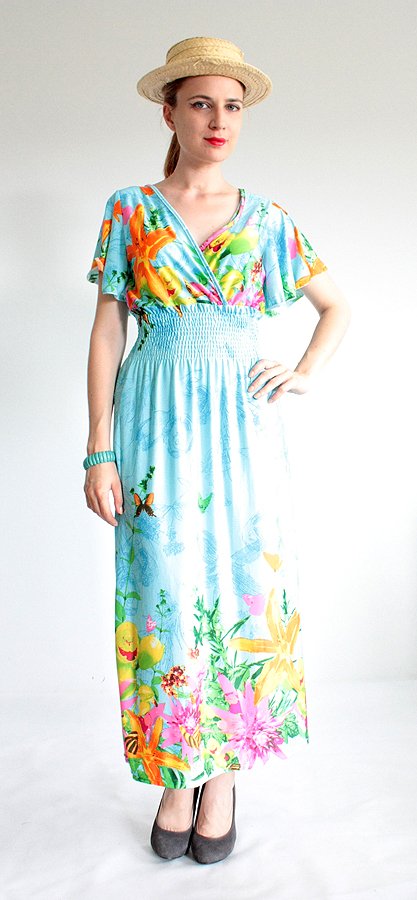 Długa sukienka w piękne, letnie wzory. W talii wszyto gumki, dzięki którym sukienka podkreśla talię i dopasowuje się do sylwetki. Materiał jest miły, "chłodzący" w dotyku (jest to prawdopodobnie polyester+elastan).