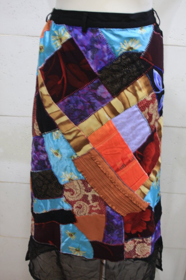 patchworkowa grubsza maxi spódnica, gdzieniegdzie wyszywana cekinami, po bokach małe rozcięcia, w pasie z tyłu wszyta gumka, brak informacji o składzie materiału