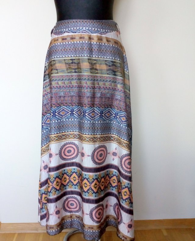 Długa spódnica z satynowej tkaniny, z ładnym wzorem i kolorystyką, z tyłu w pasie wciągnięta guma, po bokach szlufki na pasek