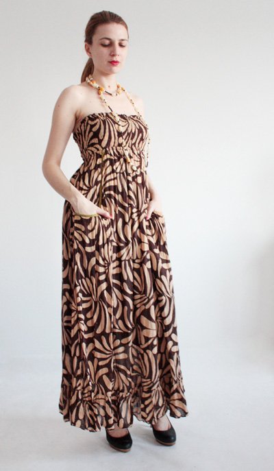 Bawełniana sukienka maxi. Posiada podszewkę wykonaną również z bawełny. Na wysokości biustu wszyte gumki, które utrzymują sukienkę na miejscu. Ciekawe detale w postaci głębokich kieszeni.