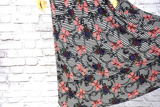 Długa sukienka o poszerzanym luźniejszym kroju w paski , łańcuchy i kokardki, zakładana na jedno ramiączko, w talii szerszy pas na marszczonej gumie .Sukienka wykonana z doskonale układającej się delikatnie lejącej tkaniny. Nowa z metką.