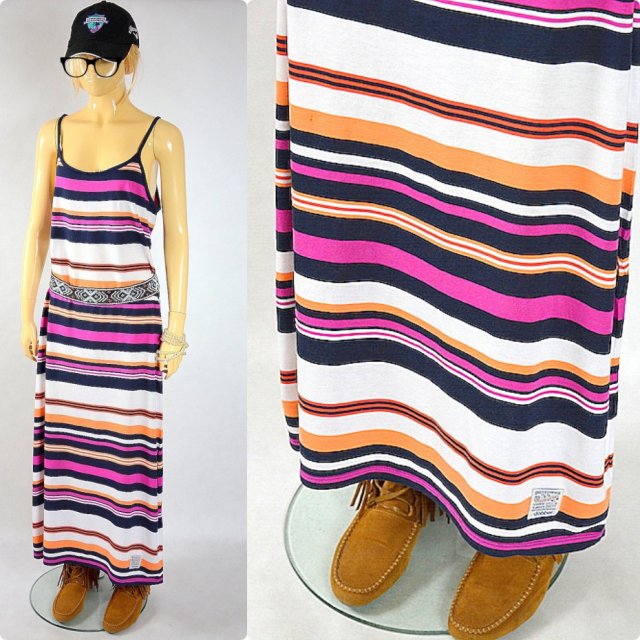 Markowa długa sukienka w kolorowe paski marki Dobber wykonana z wysokiej jakości bawełny, fason luźniejszy- poszerzany, góra na ramiączkach,u dołu z lewej strony naszyte logo marki. Sukienka idealna do noszenia zarówno luźno jak i w wersji z paskiem .( Sprzedawana bez dodatków ).