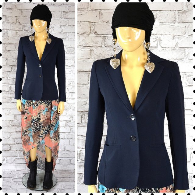 Elegancka , granatowa marynarka od MaxMary o klasycznym kroju, ładnie skrojona, taliowana, zapinana na guziki, w ramionach delikatne modelujące poduszki, po bokach kieszenie. Całość na podszewce.