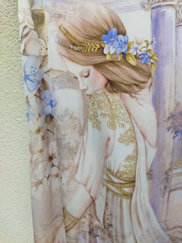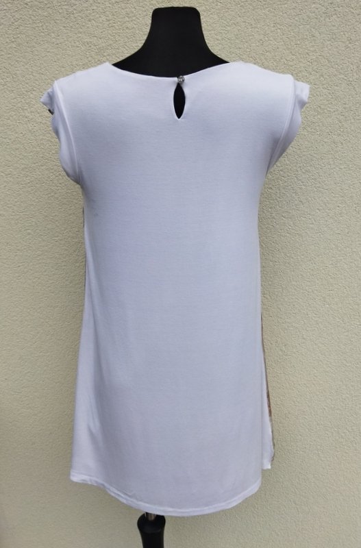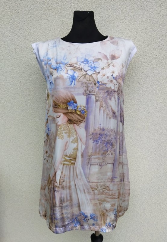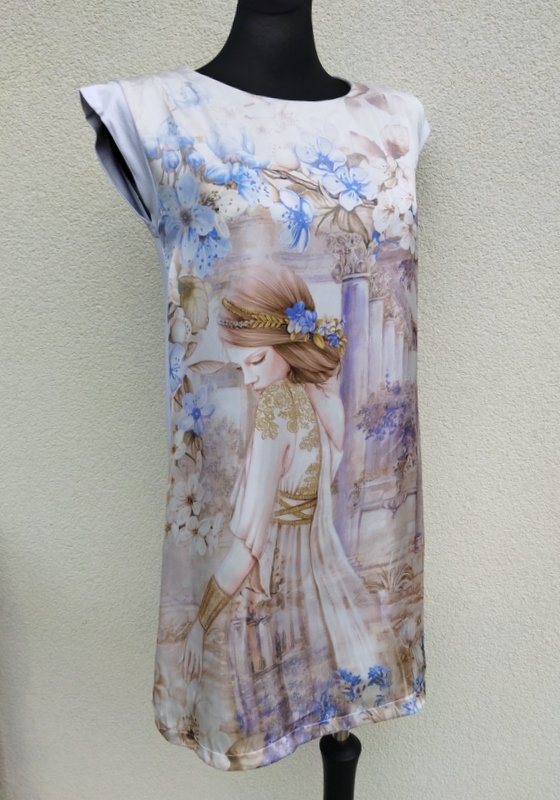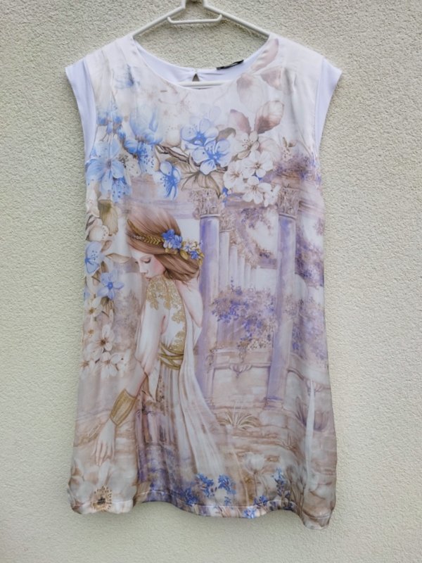 Sukienka z łączonych materiałów ; przód z wzorzystej tkaniny w delikatnych pastelowych kolorach, tył z wiskozowej tkaniny dzianinowej w białym kolorze. Trapezowy fason z owalnym dekoltem z zapięciem na guziczek na plecach. Na rozciągliwej podszewce