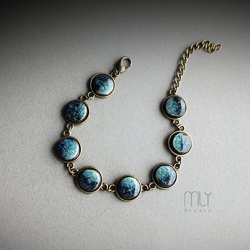 Efektowna bransoletka wykonana z ceramicznych elementów, szkliwionych mieszanką zielonych szkliw, elementów metalowych w kolorze starego złota Obwód regulowany, średnica elementu ceramicznego około 10mm . Polecam . Termin realizacji zamówienia to 1-2 dni.